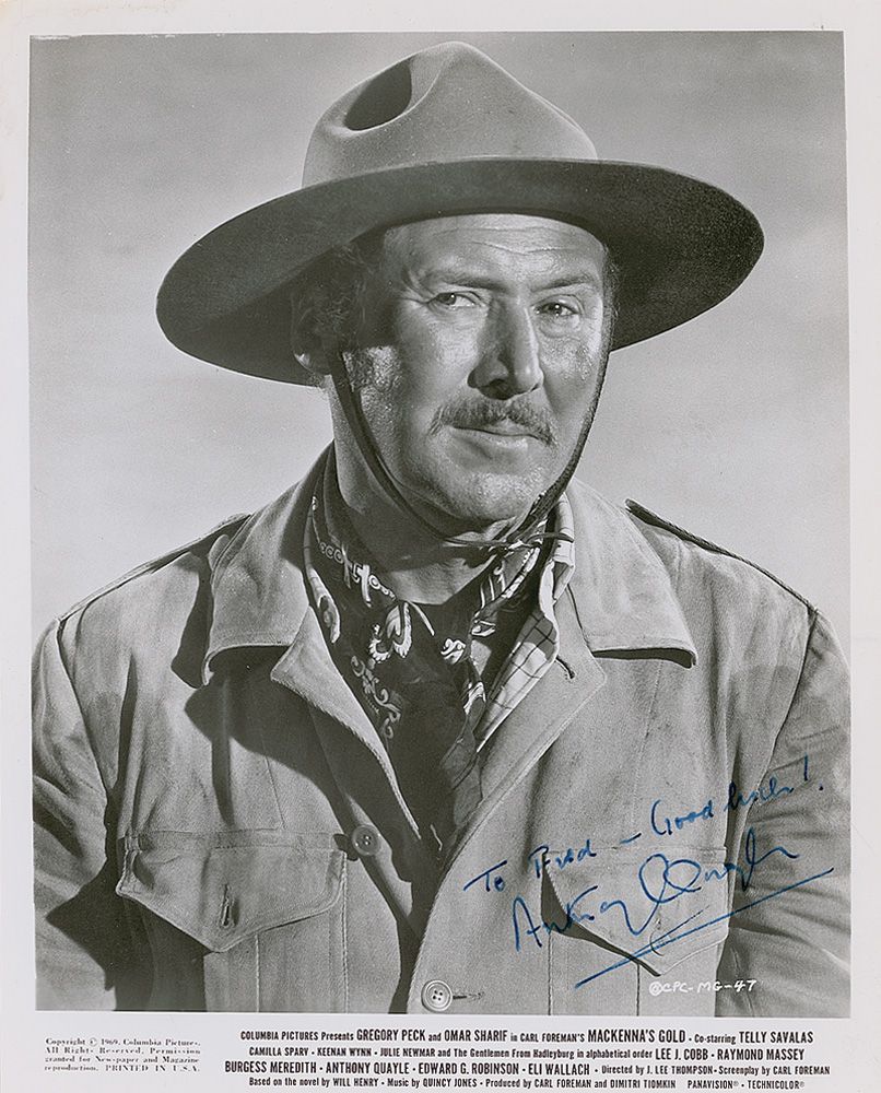Glossy 8 x 10 Columbia Pictures promotional photo for Mackenna’s Gold, signed and inscribed in blue ink “To Fred—Good luck! Anthony Quayle.” In fine condition, with a few scattered surface marks and impressions.