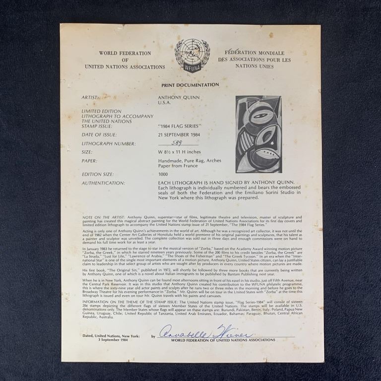 Anthony Quinn's "1984 Flag Series" limited edition print, signed and numbered 589/1000 lower middle. This is a colourful piece, in an astract style. Some spotting in left and right margins, otherwise in excellent condition. Included with certificate of authenticity from the World Federation of United Nations Associations