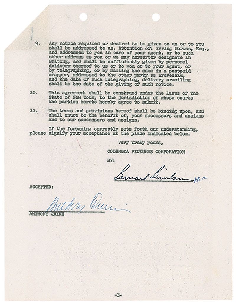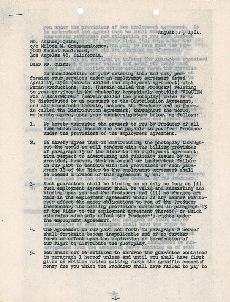 DS, three pages, 8.5 x 11, August 15, 1961. Agreement between Quinn and Columbia Pictures in which he accepts general terms and conditions “relating to your services in the photoplay tentatively entitled ‘Requiem for a Heavyweight.’” In fine condition, with expected filing holes to top. Quinn played the lead role of boxer Louis ‘Mountain’ Rivera in the film.