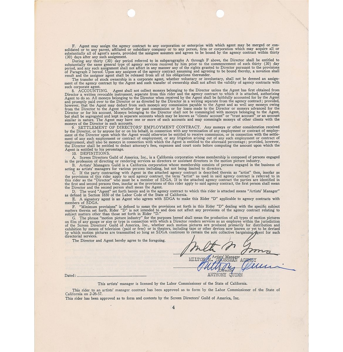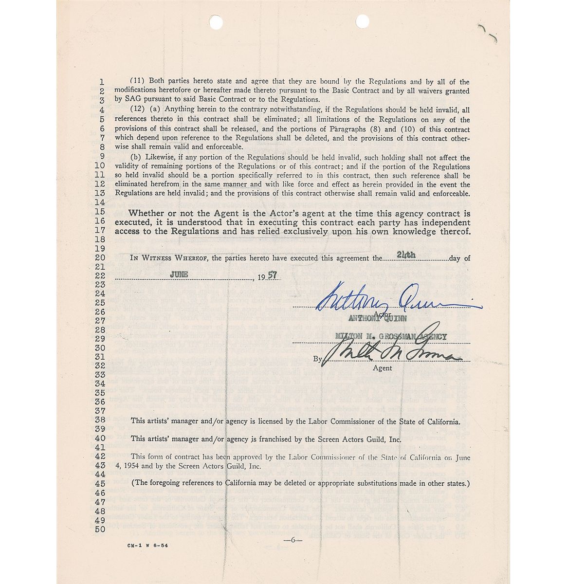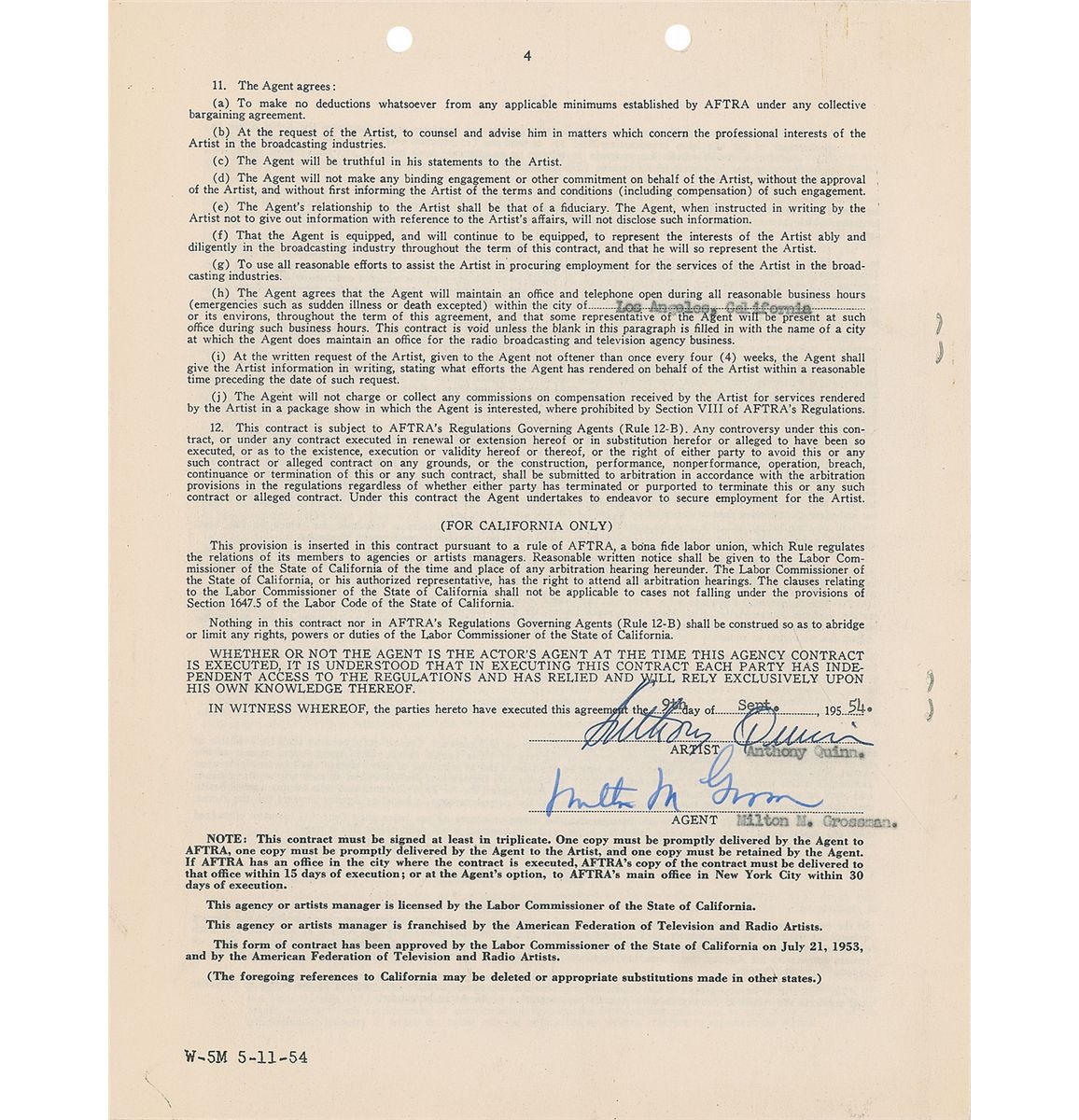 Three agency documents, each signed at the conclusion by Anthony Quinn and his agent Milton M. Grossman, including standard AFTRA contracts dated 1954 and 1957, and an undated Screenwriter’s Guild rider. In overall fine condition, with expected document wear.