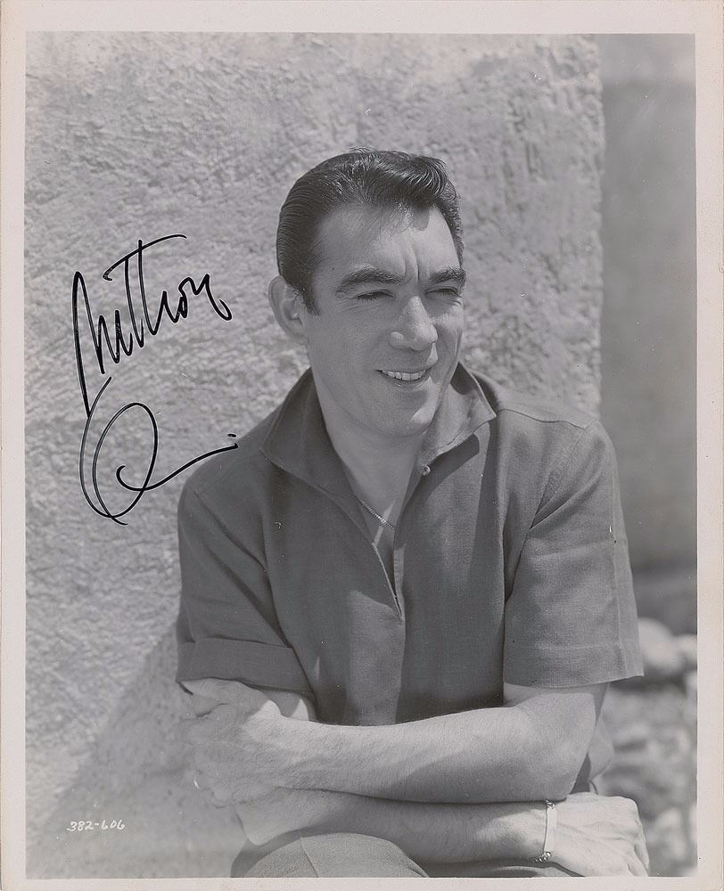 Glossy 8 x 10 studio portrait of a young Quinn with slicked back hair and crossed arms, signed in black felt tip, "Anthony Q." In very fine condition. From the Harvey and Rhoda Kuflik Collection.
