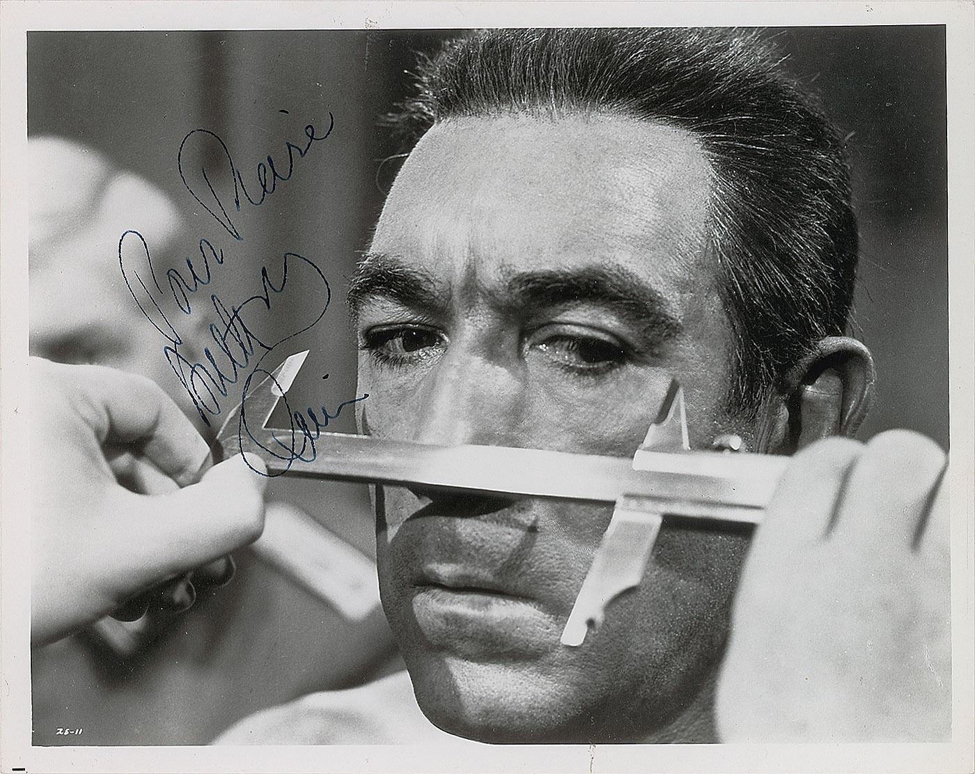 Vintage glossy 10 x 8 photo of Quinn as Johann Moritz in the 1967 WWII film The 25th Hour, signed and inscribed in fountain pen, "Pour Pierre, Anthony Quinn.” In fine condition.