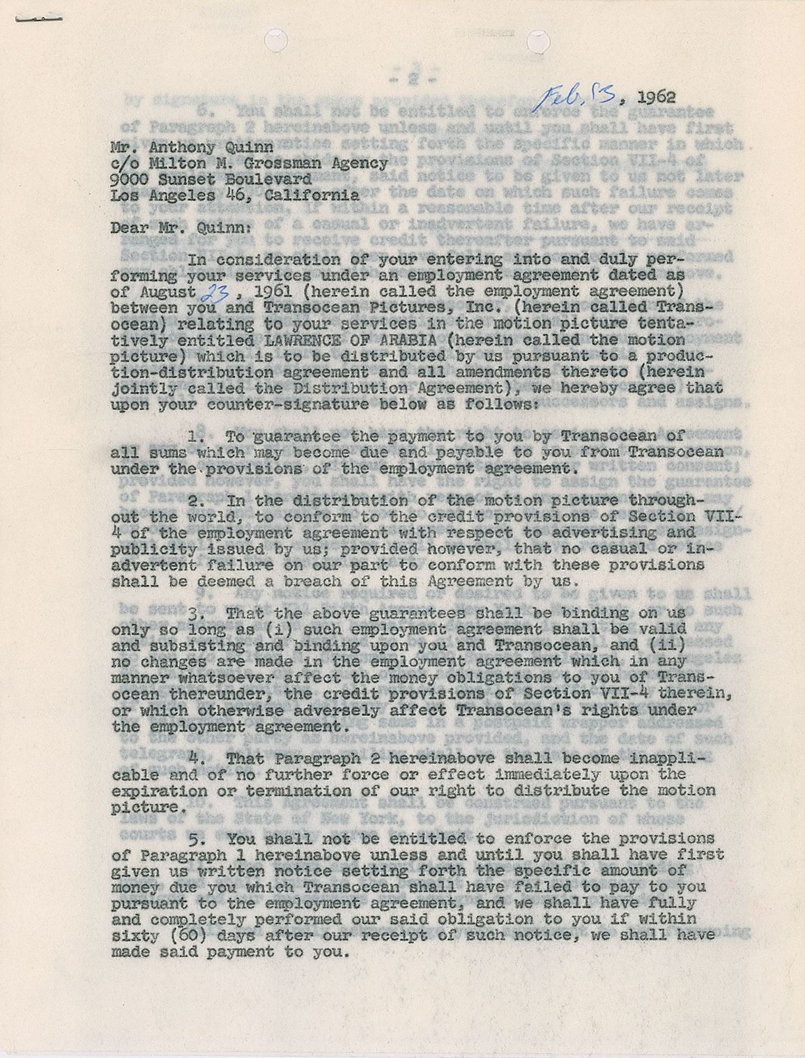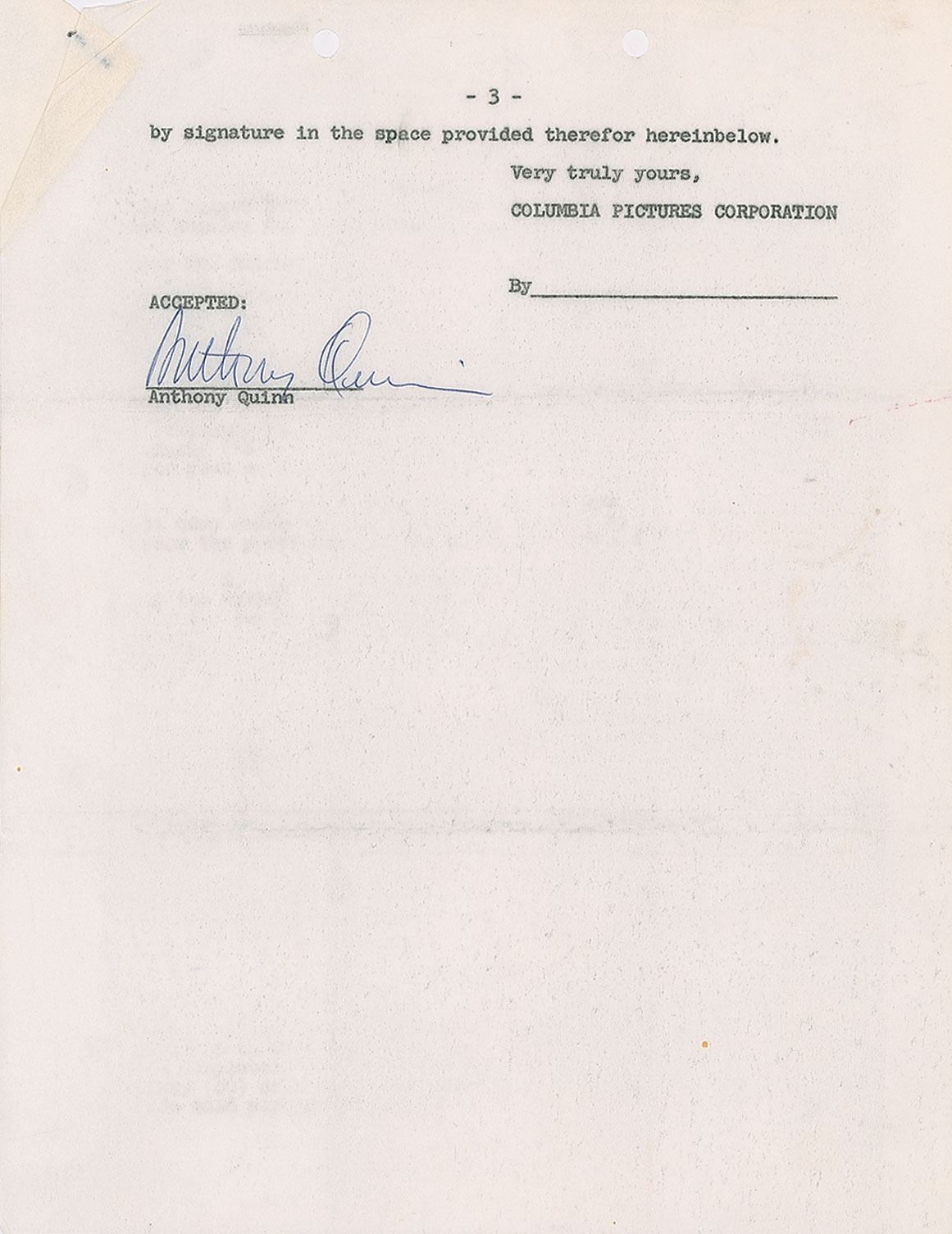 DS, three pages, 8.5 x 11, February 13, 1962. Payment guarantee document relating to Quinn's "services in the motion picture tentatively entitled Lawrence of Arabia." Signed at the conclusion in ballpoint by Quinn. In fine condition. Quinn played the role of Auda Abu Tayi, the leader of the powerful local Howeitat tribe, who aligns himself with T. E. Lawrence in the Arab revolt. He relished the part, insisting on applying his own makeup to maintain historical accuracy and at one time even being mistaken for a local tribesman.