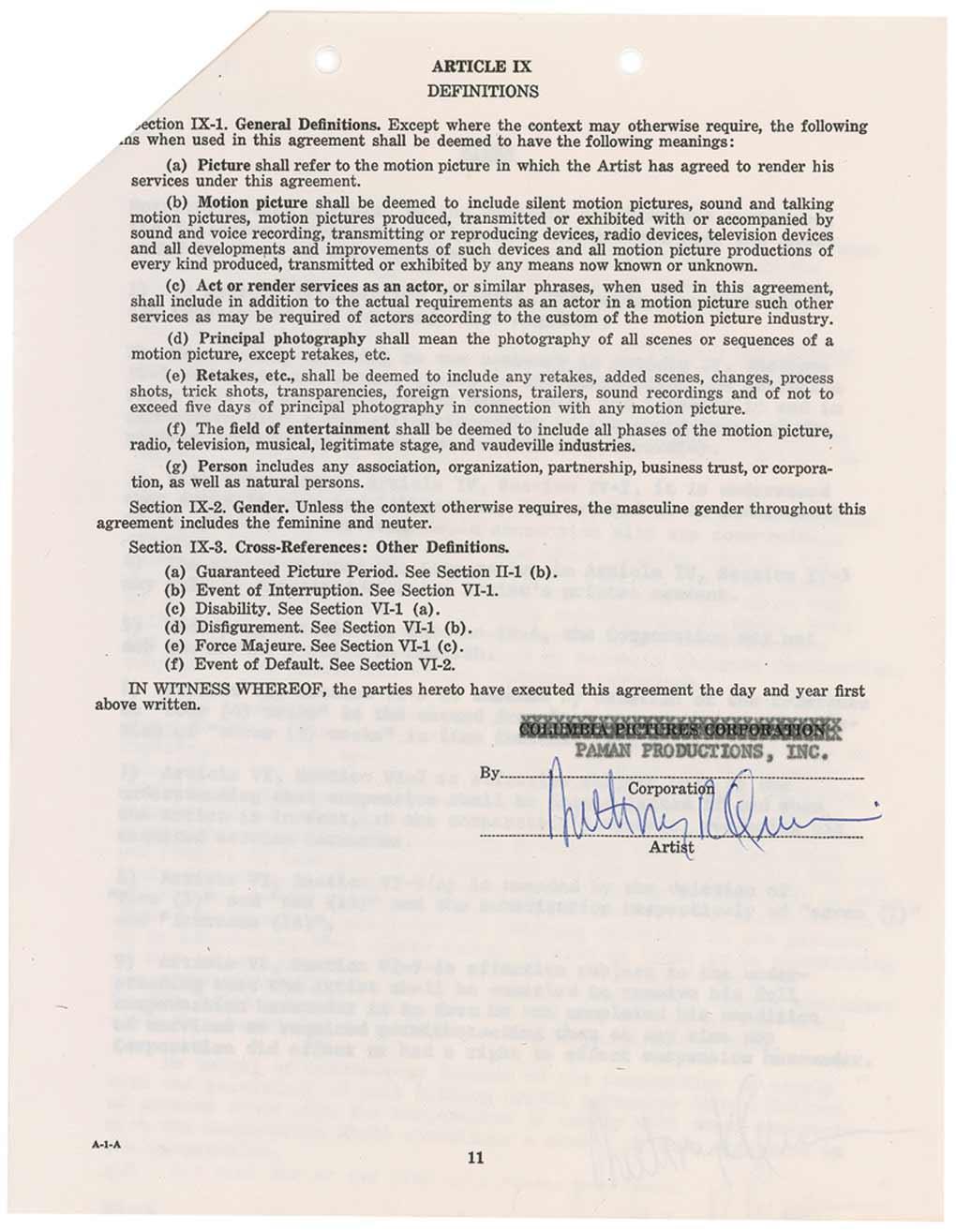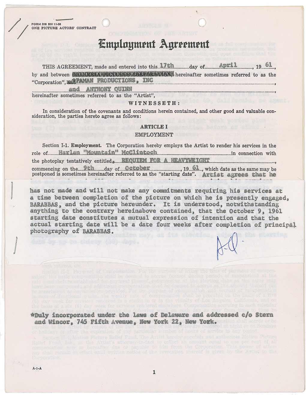 DS, thirteen pages, 8.5 x 11, April 17, 1961. A lengthy agreement engaging Quinn to appear in the role of Harlan “Mountain” McClintoch in Requiem for a Heavyweight for a salary of $175,000. Signed once on each of the last three pages by Quinn, as well as initialing the small rider stapled to the front page, regarding his start date as it relates to the filming of Barabbas. In fine condition, with mild handling wear, staples to left edge and top corner, and punch holes to top of pages.