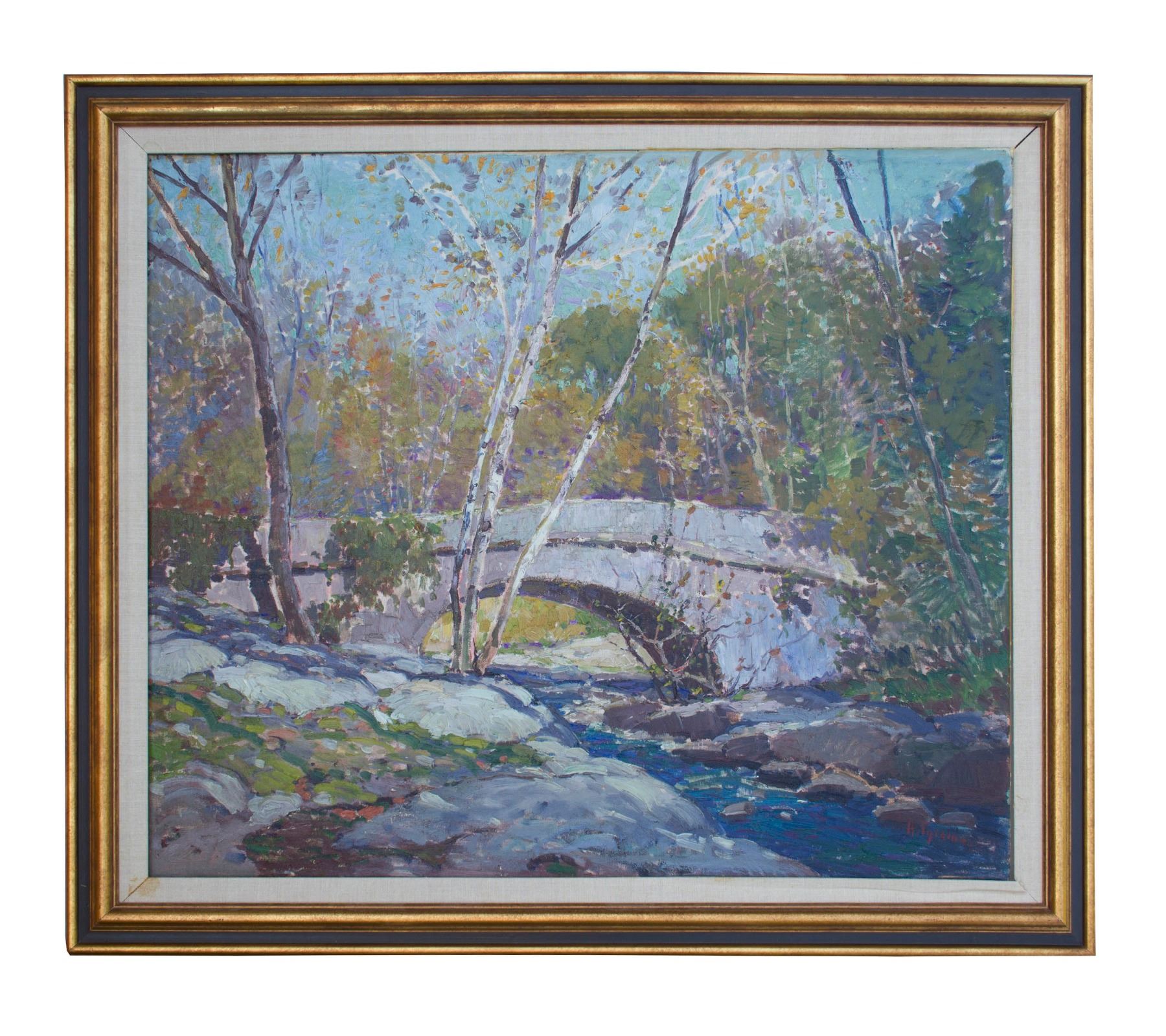 Anthony Thieme oil on canvas entitled ''Bridge in Autumn'', one of his signature landscape paintings in the modern impressionist style of the Rockport School. Signed ''A. Thieme'' at lower right and titled on the reverse. Measures 36'' x 30'', likely in original frame. Very good condition.