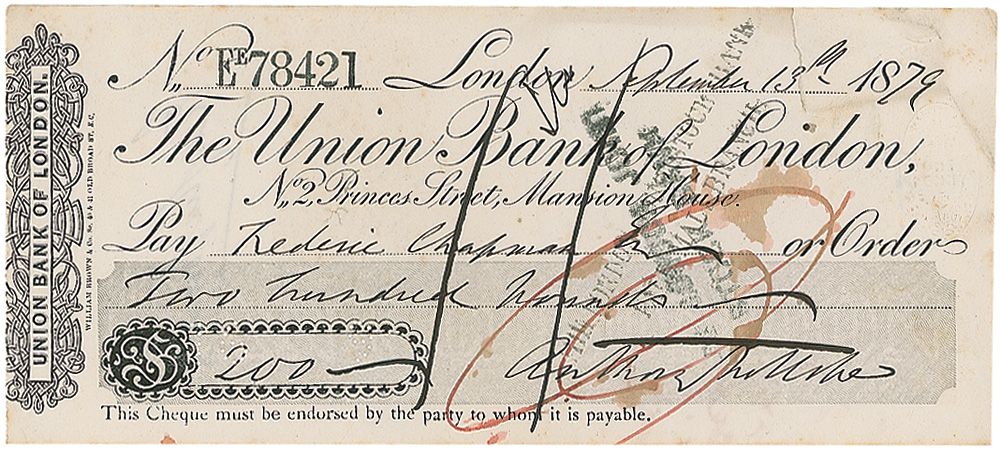 One of the most successful, prolific, and respected English novelists of the Victorian era (1815–1882). Union Bank of London check, 7 x 3, filled out and signed by Trollope, payable to Frederic Champan for £200.00, September 13, 1879. In very good condition, with two vertical folds, ink cancellations and stamp over signature, repaired tear to top edge, small set of cancellation holes, and scattered toning and soiling. Champan was a partner at Trollope’s publishing house, Chapman & Hall.