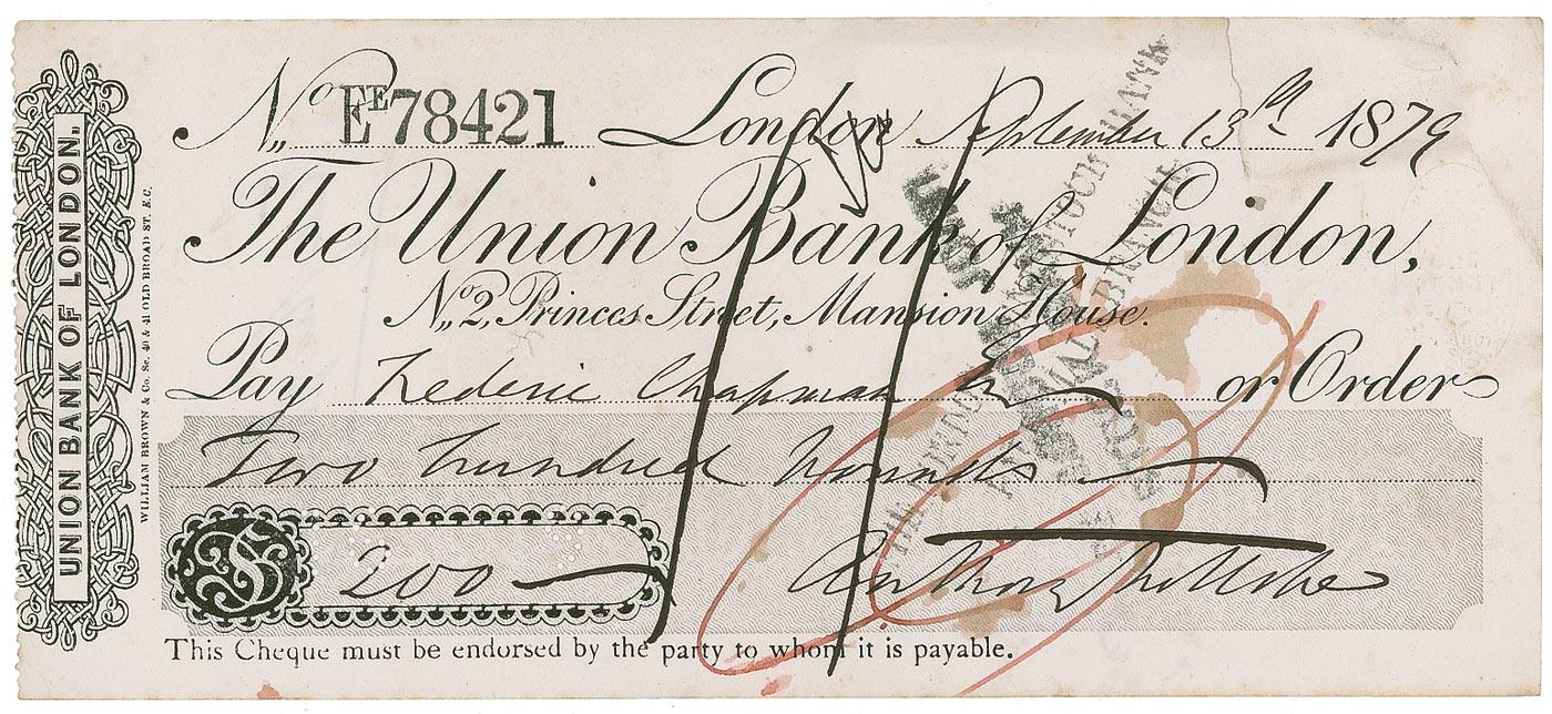One of the most successful, prolific, and respected English novelists of the Victorian era. Bank check, 7.25 x 3.25, filled out and signed by Trollope, payable to Frederic Chapman for £200.0.0, September 13, 1879. In very good condition, with ink cancellations and stamp over signature, repaired tear to top edge, and scattered toning and soiling.