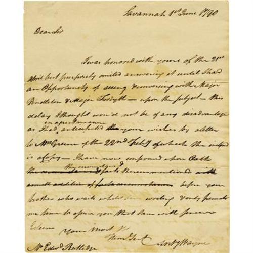 <B>Anthony Wayne Autograph Letter Signed</B></I> “<I>Anty Wayne</B></I>,” one page, 8” x 9.75”. Savannah, June 1, 1790, to Edward Rutledge.<B> </B></I>In full, <I>“I was honored with yours of the 21st April but purposely omitted answering it until I had an Opportunity of seeing & conversing with Major Pendleton & Major Forsyth - upon the subject - this delay I thought wou'd not be of any disadvantage as I had in a great manner anticipated your wishes by a letter to Mrs Greene of the 22nd Feby of which the inclosed is a Copy - I have now confirmed upon Oath the circumstances & facts therein mentioned before your brother who waits whilst I am writing & only permits me time to assure you that I am with sincere Esteem.”</B></I> Catharine “Caty” Littlefield and Nathaniel Greene were married from 1774 until his sudden death in 1786, leaving her a 32-year-old widow with five children. During the time he commanded the Southern Department of the Continental Army, General Greene, finding a shortage of the food, clothing, and equipment needed for his soldiers, purchased what was needed using his own money, anticipating reimbursement from the Continental Congress. He even signed promissory notes, giving his property as a guarantee of payment. But Congress didn't have funds to reimburse Greene, so he borrowed money from his friends to pay off some of his notes. After his death, Mrs. Greene was forced to borrow money from friends for living expenses. When Washington became President in 1789, he advised her to press Congress for reimbursement. Secretary of the Treasury Alexander Hamilton became her chief advisor and Secretary of War Henry Knox prepared the claim and suggested what documents she required to support her case. She returned to her home in Georgia, hired <B>Major Nathaniel Pendleton</B></I> as her lawyer, and began gathered affidavits, documents and eyewitness testimonies to her husband's expenditures. Among the evidence presented before Congress was a 1784 assignment from <B>Major Robert Forsyth</B></I> to Greene of debts due Hunter, Banks, & Co., a company that supplied the army with provisions. Forsyth had served under Greene and was a partner in Hunter, Banks. After the war, Wayne moved from Pennsylvania to Georgia and settled upon a tract of land granted him by the state for his military service, adjoining Greene's plantation. Edward Rutledge, a signer of the Declaration of Independence, was co-executor of General Greene's estate.<B> </B></I>Among the affidavits given her, and submitted to Congress, was one from General Anthony Wayne. In this letter to Rutledge from Savannah, Wayne notes he had sent a letter to Mrs. Greene and had <I>“confirmed upon Oath the circumstances & facts therein mentioned.”</B></I> Wayne tells Rutledge that his brother (Supreme Court Justice John Rutledge) was present while he signed the affidavit and wrote this letter. Justice Rutledge had been in neighboring South Carolina in May for the convening of the Circuit Court for the District of South Carolina. Later in 1790, “Mad Anthony” Wayne was elected to Congress. After being sworn in on March 4, 1791, he spoke with his new colleagues, garnering support for Mrs. Greene's petition. A bill was introduced in the House. But then evidence was presented that his election was rigged and on March 16, 1792, it was resolved unanimously, by a vote of 58-0, “That Anthony Wayne was not duly elected a Member of this House.” Without her greatest supporter in the House, Mrs. Greene feared the worst. The vote was close; on April 4, 1792, the House approved the bill, 29-26. Wayne was unemployed for less than four weeks. In the midst of Senate deliberations, on April 9, 1792, President Washington nominated Wayne as Major General to succeed Arthur St. Clair whose army was soundly defeated by the Miami Indians in battle on November 4, 1791. Only the Senate is required to consent to presidential nominations and on April 11th, it did. After the Senate passed Mrs. Greene's bill, it was sent to the President. The <I>Journal of the House of Representatives</B></I> reported that on April 27, 1792, “A message was received from the President of the United States, by Mr. Lear, his Secretary, notifying that the President did, this day, approve and sign an act which originated in this House, entitled 'An act to indemnify the estate of the late Major General Nathaniel Greene for a certain bond entered into by him, during the late war.'” Secretary of the Treasury Alexander Hamilton signed a government check payable to Catharine Greene for $23,500 and a promissory note for another $23,500 payable by Congress within three years. Light soiling. Fine condition.<BR><BR><b>Shipping:</b> Flat Material, Small (<a target="_blank" href="http://www.heritageauctions.com/common/shipping.php">view shipping information</a>)