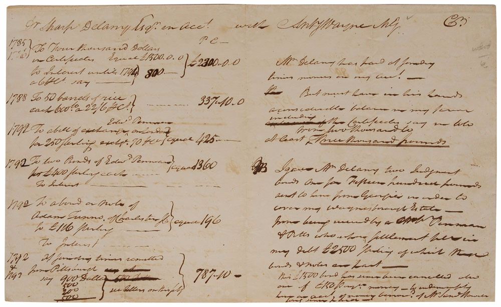 Revolutionary War general (1745–1796) whose daring tactics earned him the nickname ‘Mad Anthony.’ Scarce ADS, signed “Ant'y Wayne MG,” one page, 13 x 8, annotated on the reverse with a date of July 14, 1794. Financial document headed, "Dr. Sharp Delany Esq'r on acc't with Ant'y Wayne M.G.," with the left side listing several different financial transactions dated between 1785 and 1793. Wayne has written several notes on the right side concerning the debt. In fine condition. Sharp Delany, a Philadelphia doctor and apothecary, was Wayne's closest friend and looked after the general's affairs when he was away from home.