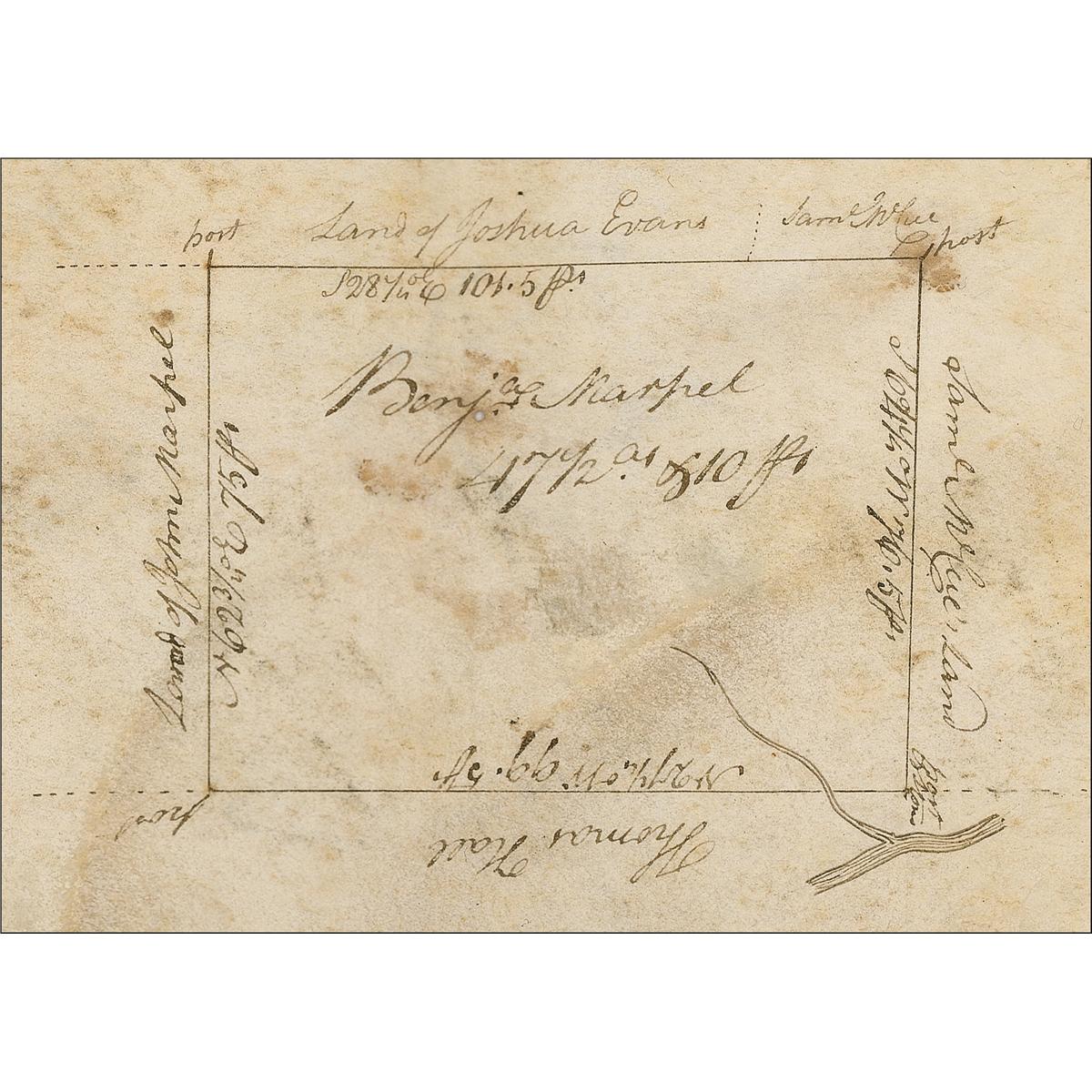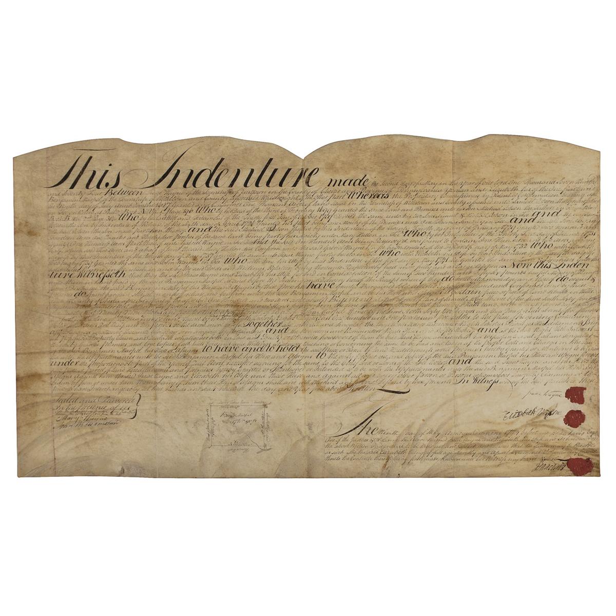 Revolutionary War general (1745–1796) whose daring tactics earned him the nickname “Mad Anthony.” After demonstrating his exceptional military abilities at Ticonderoga, Stony Point, and West Point, Wayne served in the Pennsylvania legislature and as a delegate to the Constitutional Convention. Following a year in the U.S. Congress, Wayne, at Washington’s request, emerged from “retirement” to lead an expedition in the Northwest Indian War. Scalloped-topped vellum autograph document, with “Wayne” penned 10 times in the text, one page, 27 x 16, May 2, 1774. A lengthy document with over 1000 words in Wayne’s hand as a surveyor of land his parents, Isaac and Elizabeth Wayne, were preparing to sell. In part: “Unto Gabriel Wayne in fee by Indenture of the Fifteenth day of May 1732 who with Elizabeth his wife by their Indenture on the twelfth day of May 1731 Granted unto the Isaac Wayne partly hereto in Fee who with Elizabeth his wife…Granted to same unto John Wayne in Fee who with Jane his wife by their Indenture…re-granted the same Land & Premises unto the said Isaac Wayne in fee.” Below the text, Wayne has sketched and labeled a 2.5 x 2 rectangular map of the land involved, writing the names of the adjoining land holders on the borders. Heavy intersecting folds, scattered toning, creasing, and rippling, with toning heavier in several spots, otherwise very good condition. Document also bears three partial red wax seals.