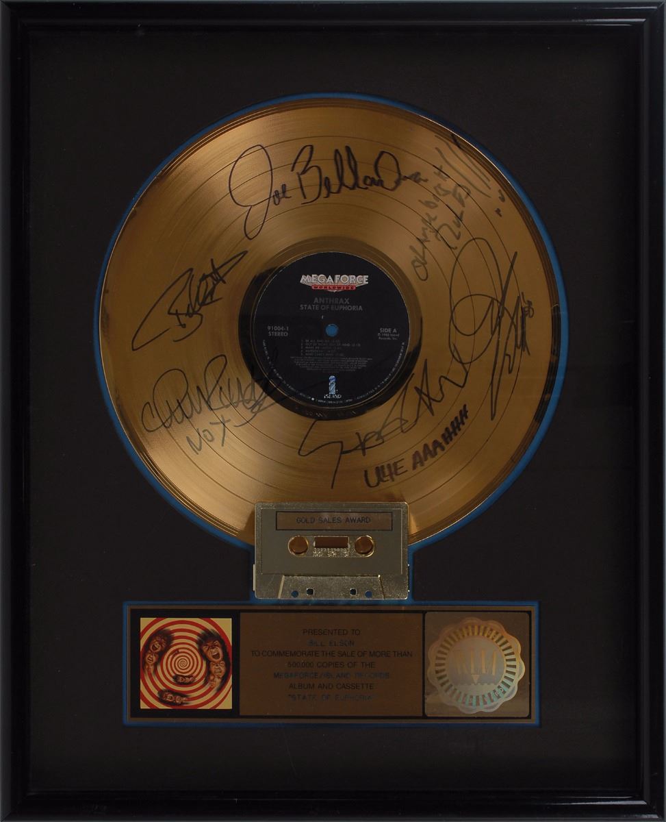 Uncommon official flower hologram-style RIAA gold record presented “to commemorate the sale of more than 500,000 copies of the Megaforce/Island Records album and cassette ‘State of Euphoria.’” Framed with its disc, cassette, and plate bearing a small image of the album cover to an overall size of 17 x 21. Signed on the disc in black felt tip by band members Scott Ian, Charlie Benante, Frank Bello, Joey Belladonna, and Dan Spitz. The backing has been replaced. In fine condition.