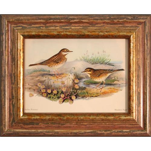 This extraordinary piece of art is a beautiful print made from an amazingly detailed lithograph of two Meadow Pipits. It was reprinted by the American Art Publishing Co. Scafa-Torabene, in 1973. The original artist created a remarkably realistic rendering of the appealing petite birds and their environment. This print is framed in an incredibly attractive frame, which is composed of a beautiful array of gold, black, mauve, and copper mottled together to create a striking compliment to the print itself. Including the exceptional frame, the dimensions of this piece are 10 ¼? x 8 ¼?. Rich in earth tones and detail, this print is truly a treasure worth acquiring considering the expense.