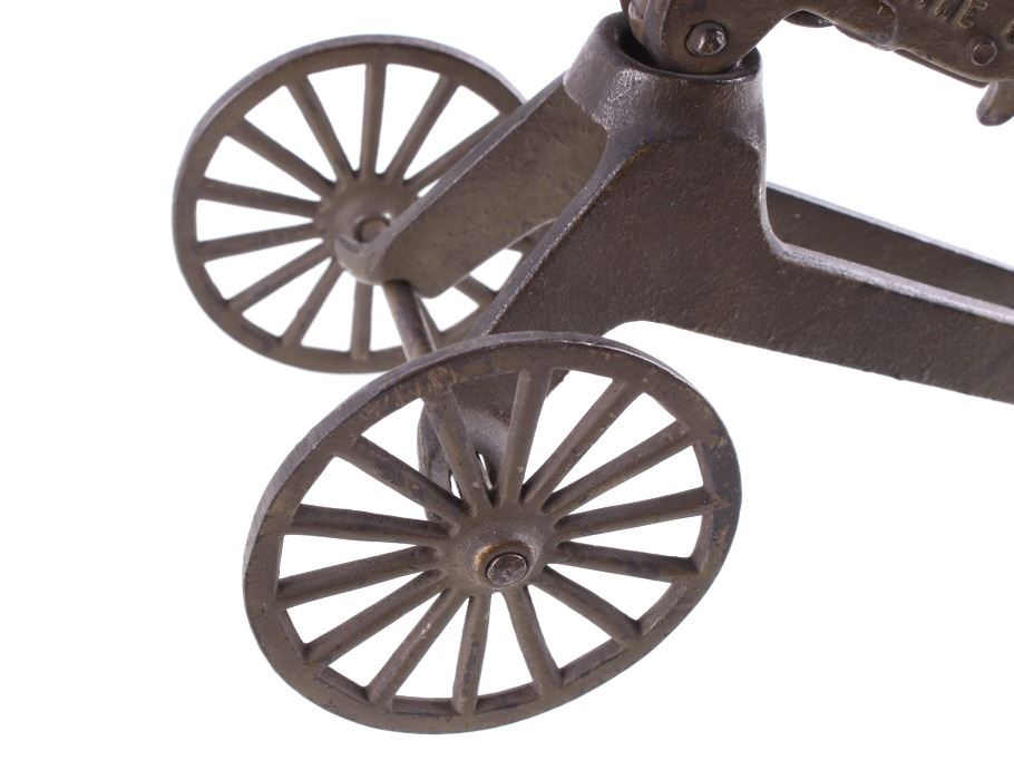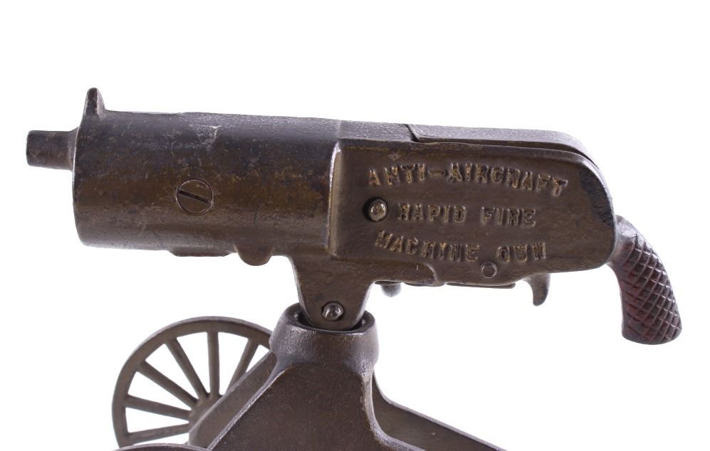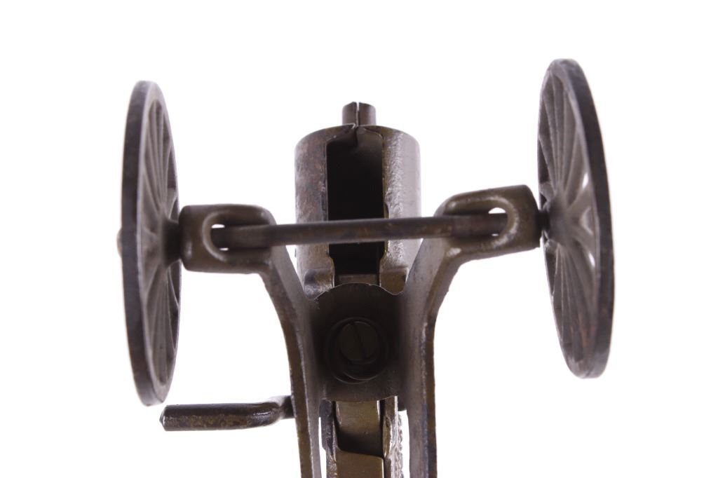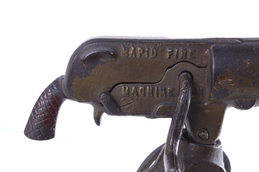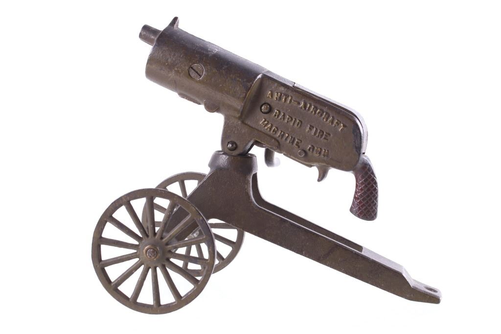 Included in this lot is a cast iron toy cap gun which makes a clicking rapid fire shooting sound when you turn the handle. This toy is made by ‘Grey Iron Casting Company – Mt. Joy, PA’ and it is marked so on the bottom of the toy. Also notice that the gun is identified on each side of it with raised lettering, and the one side reads, ‘Anti-Aircraft Rapid Fire Machine Gun’ and the opposite side reads, ‘Rapid Fire Machine Gun’. The toy gun shows a dark gray patina and working condition. The toy measures 7 ½” x 4” x 7”.