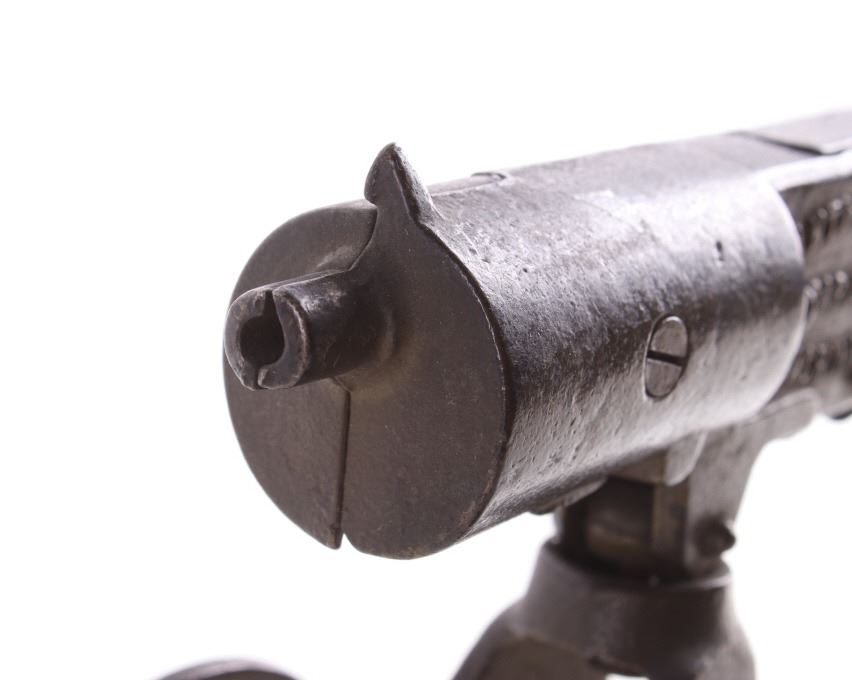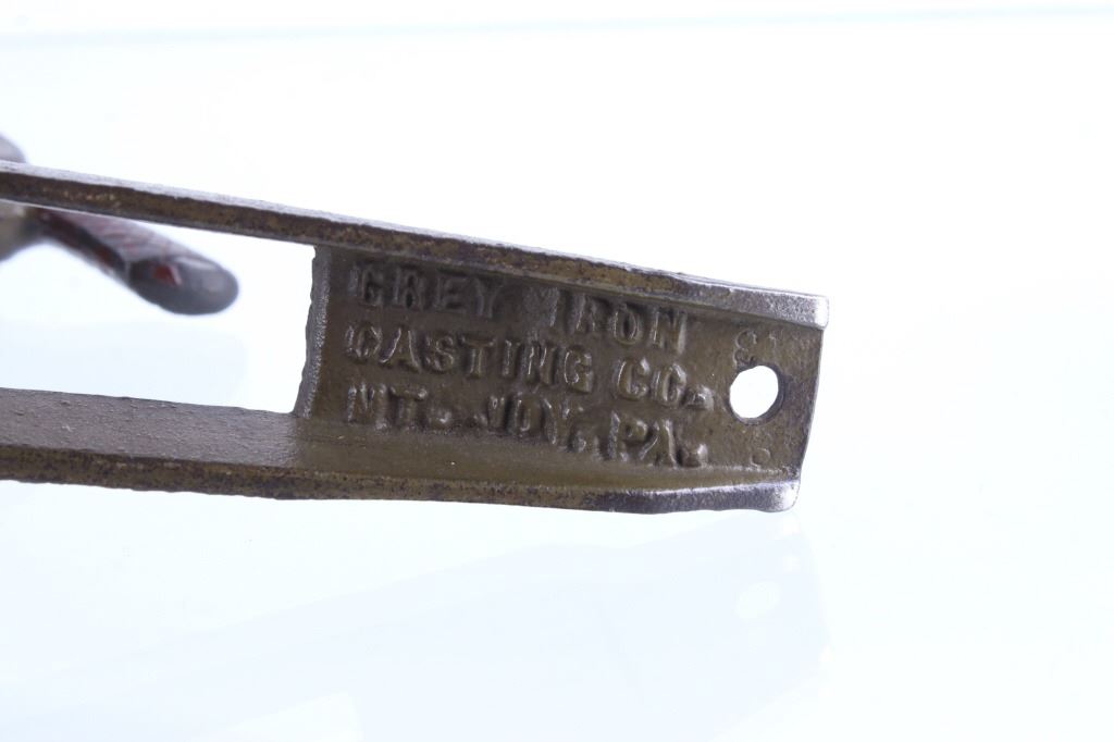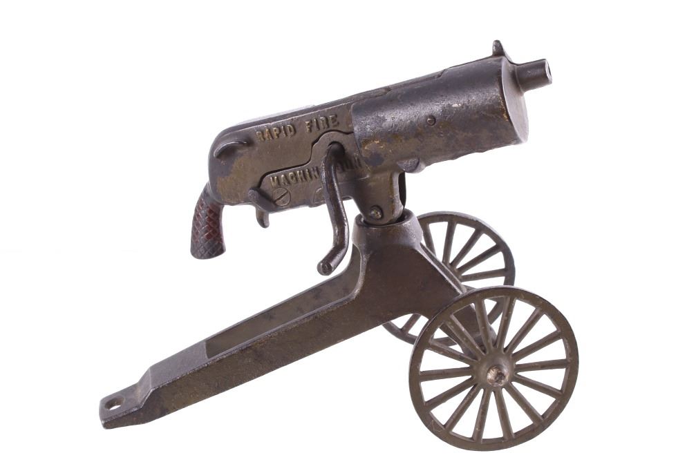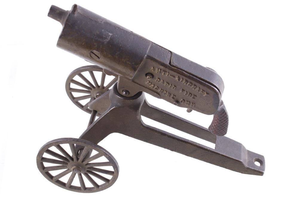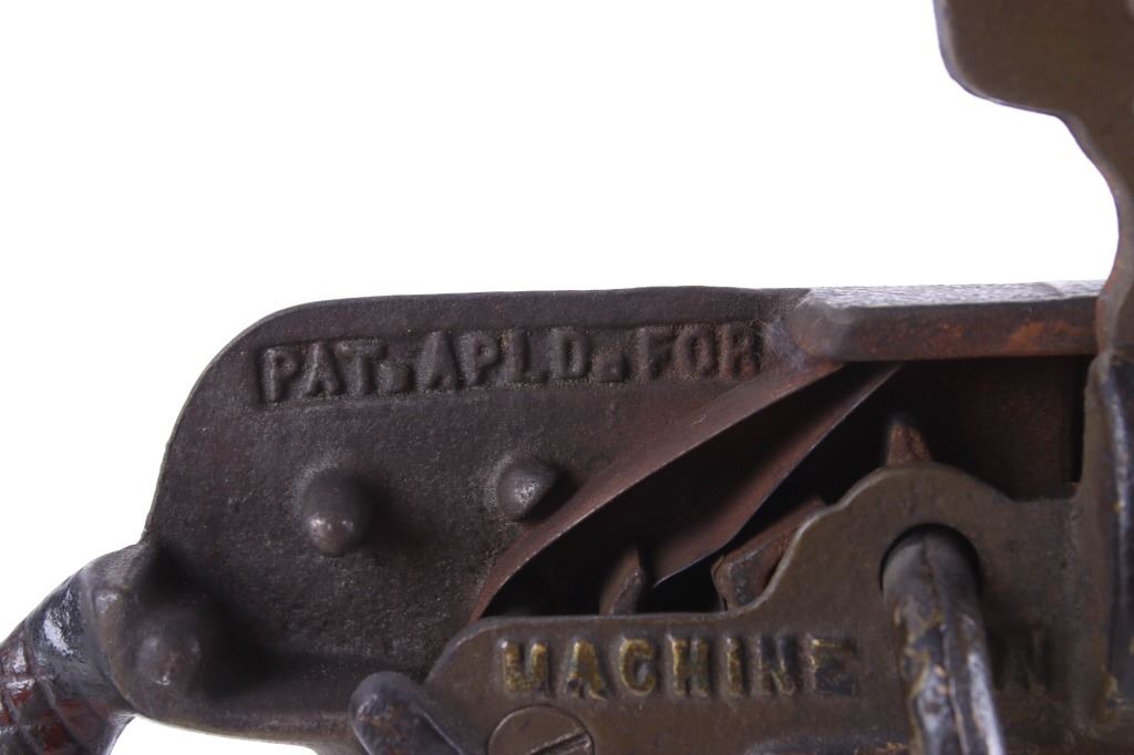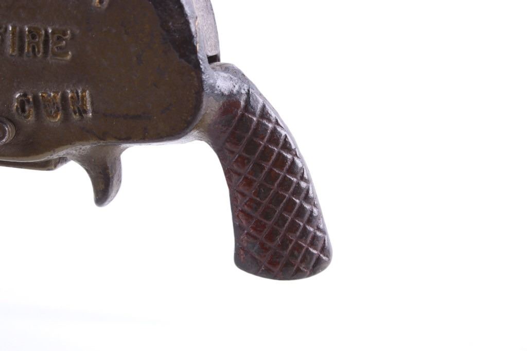 Included in this lot is a cast iron toy cap gun which makes a clicking rapid fire shooting sound when you turn the handle. This toy is made by ‘Grey Iron Casting Company – Mt. Joy, PA’ and it is marked so on the bottom of the toy. Also notice that the gun is identified on each side of it with raised lettering, and the one side reads, ‘Anti-Aircraft Rapid Fire Machine Gun’ and the opposite side reads, ‘Rapid Fire Machine Gun’. The toy gun shows a dark gray patina and working condition. The toy measures 7 ½” x 4” x 7”.