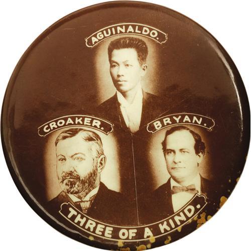 <B>Rare Anti-Bryan Button Lumping Him with Notorious Scoundrels.</B></I> This 1900 issue attempts to smear Bryan by putting him in the company of a discredited politician and the leader of the Philippine rebels who were waging an effective guerrilla war against the American occupiers after the close of the Spanish-American war. We have never seen a truly flawless example of this variety. Usually they have extensive light-colored splotches scattered over the surface. The present example exhibits a minimum amount of these marks along the rim only, extending from 4:30 to 6:30, and not affecting the design. Otherwise a very bright and pleasing example. Centering is often a problem with this variety as well, but this one is dead on. It would be hard to find an overall better copy. Size: 2 1/8".<BR><BR><b>Shipping:</b> Small Flat (<a target="_blank" href="http://www.heritageauctions.com/common/shipping.php">view shipping information</a>)