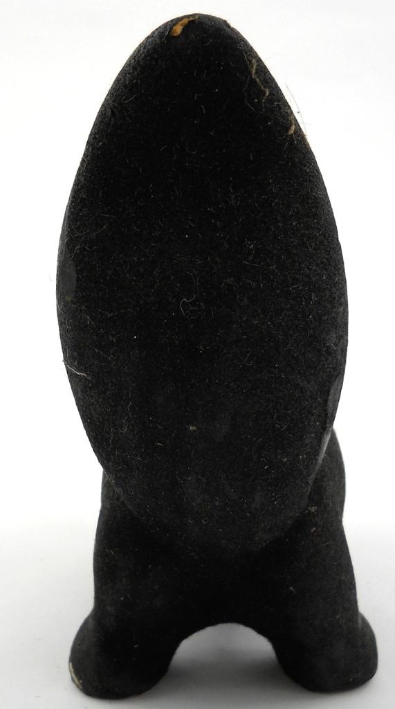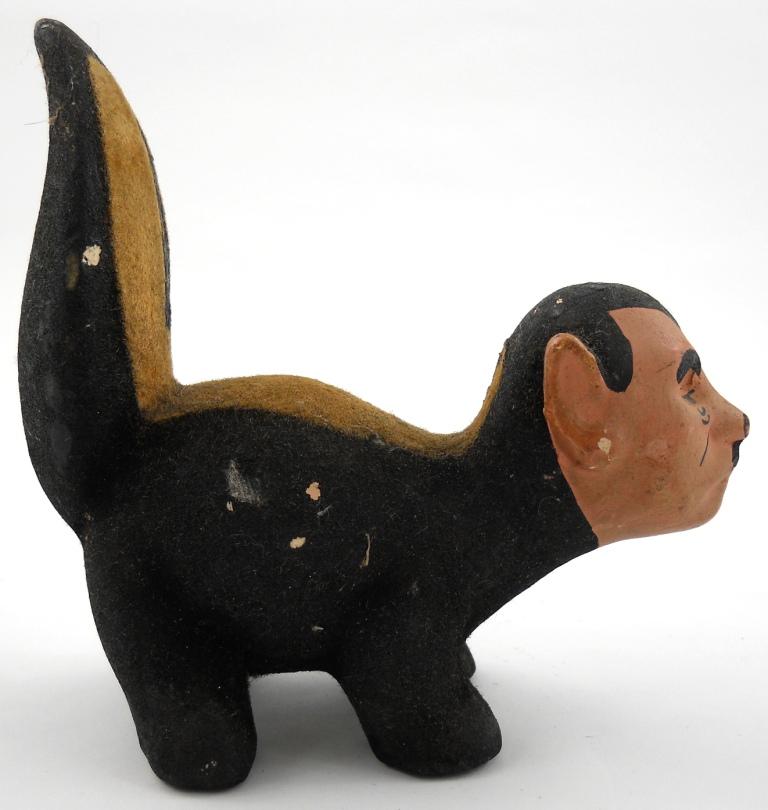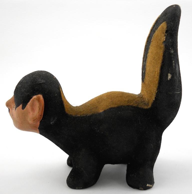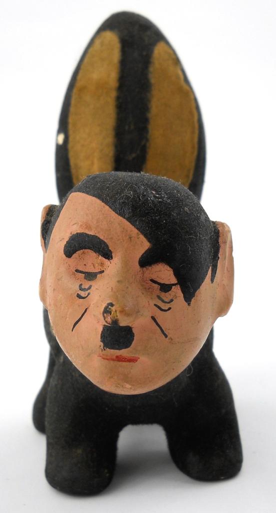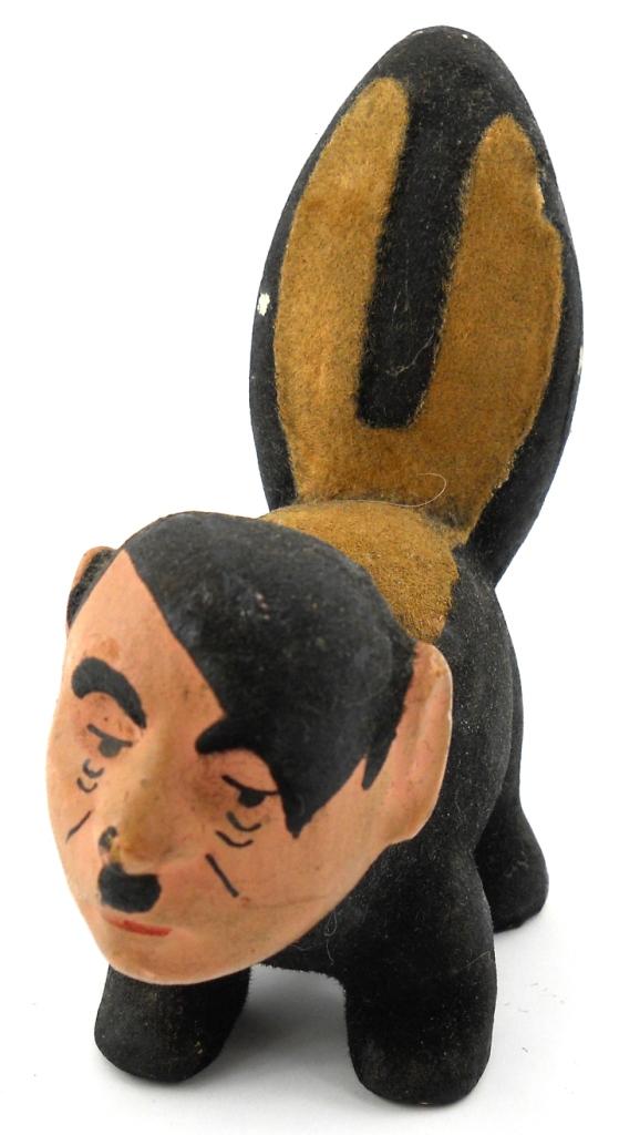 5-1/4" x 5-1/4" x 2-1/4". This is a solid plaster / chalkwear figure of a skunk with Hitler's head. The black and tan body of the skunk has a textured paint almost like fur with the head and face more a regular textured paint. This shows age and paint chips, but is in great condition and displays great.