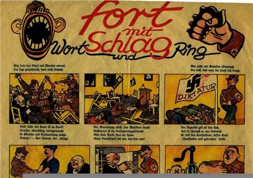 Anti-Nazi Broadside. "Fort Mit Schlag," brightly colored, printed one side, 1933, 121/2 x 171/2, showing twelve cartoon scenes, each with a four-line rhyme of the dangers of Hitler's Nazi dictatorship: loss of liberty, chaos, burning of the Reichstag, fear, etc. Captions include "Oppose Hitler...He wants you as slaves...Beware of hollow phrases...Defend justice...Your victory is the Republic's victory...." Issued by the Republic Loyalists, this effort to avert dictatorship ended in failure; the vast majority voted to leave the League of Nations, and 92% voted for a single Nazi party, headed by Hitler. Printed in Berlin prior to plebiscite of Nov. 12, 1933. Unusual presentation for that year, with Hitler pictured as a cartoon character, and Nazis shown as goons. Eyecatching graphics for historical display. Minor 1" tape mend on verso, else very fine.
