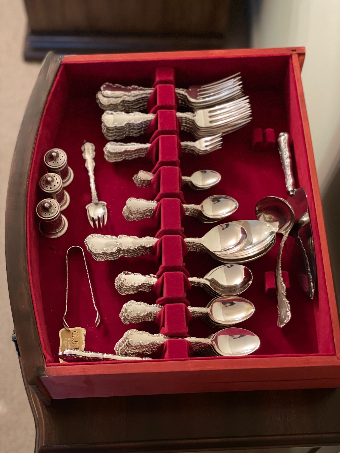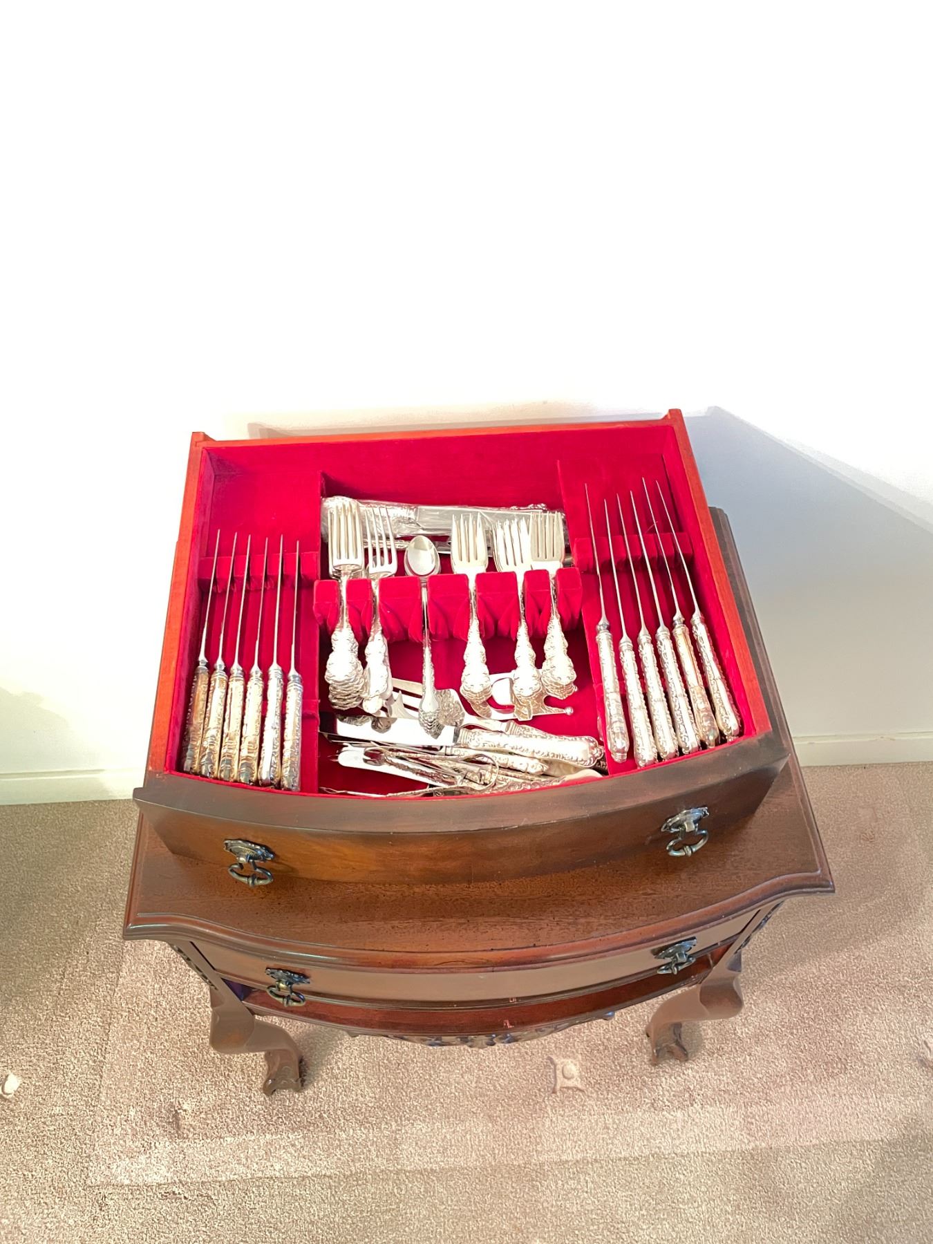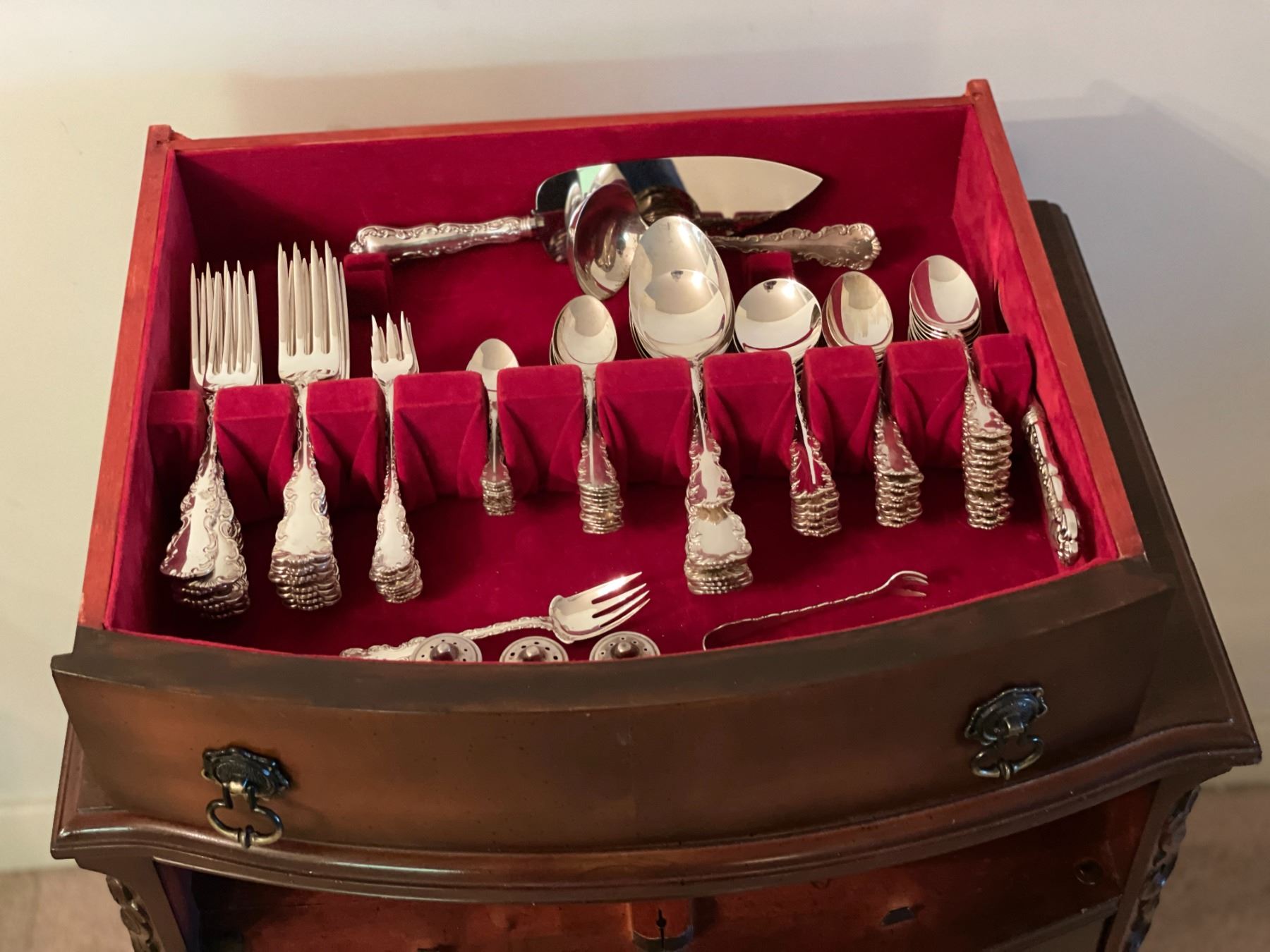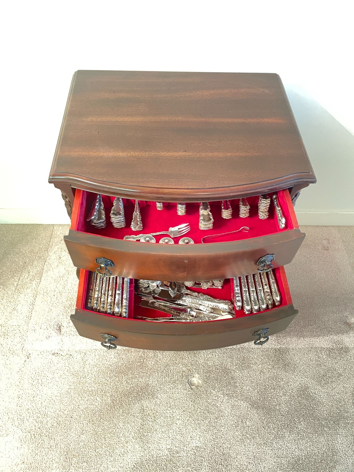 Anti-Tarnish Silverware Container dimensions 26" height x 20" wide x 16" deep. 2 drawers full of BIRKS Sterling cutlery.