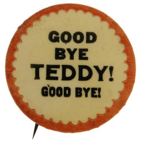 <B>Anti-Theodore Roosevelt Campaign Button,</B></I> 1 1/4", red border with GOOD/ BYE/ TEDDY!/ GOOD BYE!, red slightly faded else excellent. From the Loewenstern Collection. <BR><BR><b>Shipping:</b> Miscellaneous Collectibles, Smal (<a target="_blank" href="http://www.heritageauctions.com/common/shipping.php">view shipping information</a>)