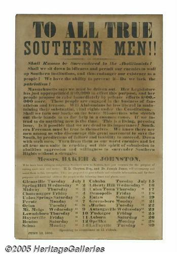 <B>Anti-abolition Alabama Broadside from 1856</B></I> Broadside, 12" x 18 1/2", issued in Alabama during the presidential election of 1856 and the crisis of "Bleeding Kansas." Titled "To All True Southern Men," the text reads: <I>"Shall Kansas be Surrendered to the Abolitionists? Shall we sit down in idleness and permit our enemies to wall up Southern institutions, and thus endanger our existence as a people? We have the ability to prevent it. Do we lack the patriotism? Massachusetts says we must be driven out. Her legislature has just appropriated $20,000 to affect this purpose, and her people propose to raise immediately by private efforts $100,000 more. These people are engaged in the business of fanaticism and treason. Will Alabamians be less liberal in maintaining their substantial, vital rights under the Constitution. Shall we turn our backs on the brave Missourians who stretch out their hands to us for help in a common cause. If we intend to do anything now is the time. This is a living, pressing issue. Is it possible we are dead to its importance? Southern Freemen must be true to themselves. We know there are men among us who discourage this great movement to save the South, by predictions of failure and inability to succeed. Down with such men. Turn from them as our worst enemies and let all true men unite in crushing out this spirit of submission to abolition aggression and willingness to surrender Southern Rights without a struggle. Messrs. Baker & Johnston, Who have been aiding in emigrating Southern men to Kansas, have just returned for the purpose of raising more men and money. H. D. Clayton, Esq. and Dr. Joseph Jones will accompany and assist them in this enterprise. They are prepared to give reliable and valuable information, and for these purposes will meet and address the people at the following times and places:"</B></I> (followed by a list of twelve locales such as Selma and Tuskegee) June 12, 1856. During the crisis in Kansas, advocates for slavery from Missouri (derisively known as "Border Ruffians") flooded the territory in order to "win" it as a slave state. Abolitionists came from New England to turn the tide in their favor, hoping to use Stephen Douglas' doctrine of popular sovereignty to achieve their goal. Opposing governments and constitutions were adopted by each side, resulting in widespread violence, notably the sack of Lawrence and John Brown's retaliatory raid on Pottawatomie Creek. South Carolina sent members of its state militia to assist in the struggle. The unrest served as a vivid prelude of the Civil War to come. As far as historical importance is concerned, it would be hard to outdo this broadside, which must rank as a great rarity, especially considering its origin. This is the first Southern political broadside of this period we have encountered. One small border tear and a 1" x 3" detached section in the bottom left corner. Mounted many years ago on cardboard, resulting in moderate browning or acid burn, especially in the upper half. Likely the only surviving example. Lot:251