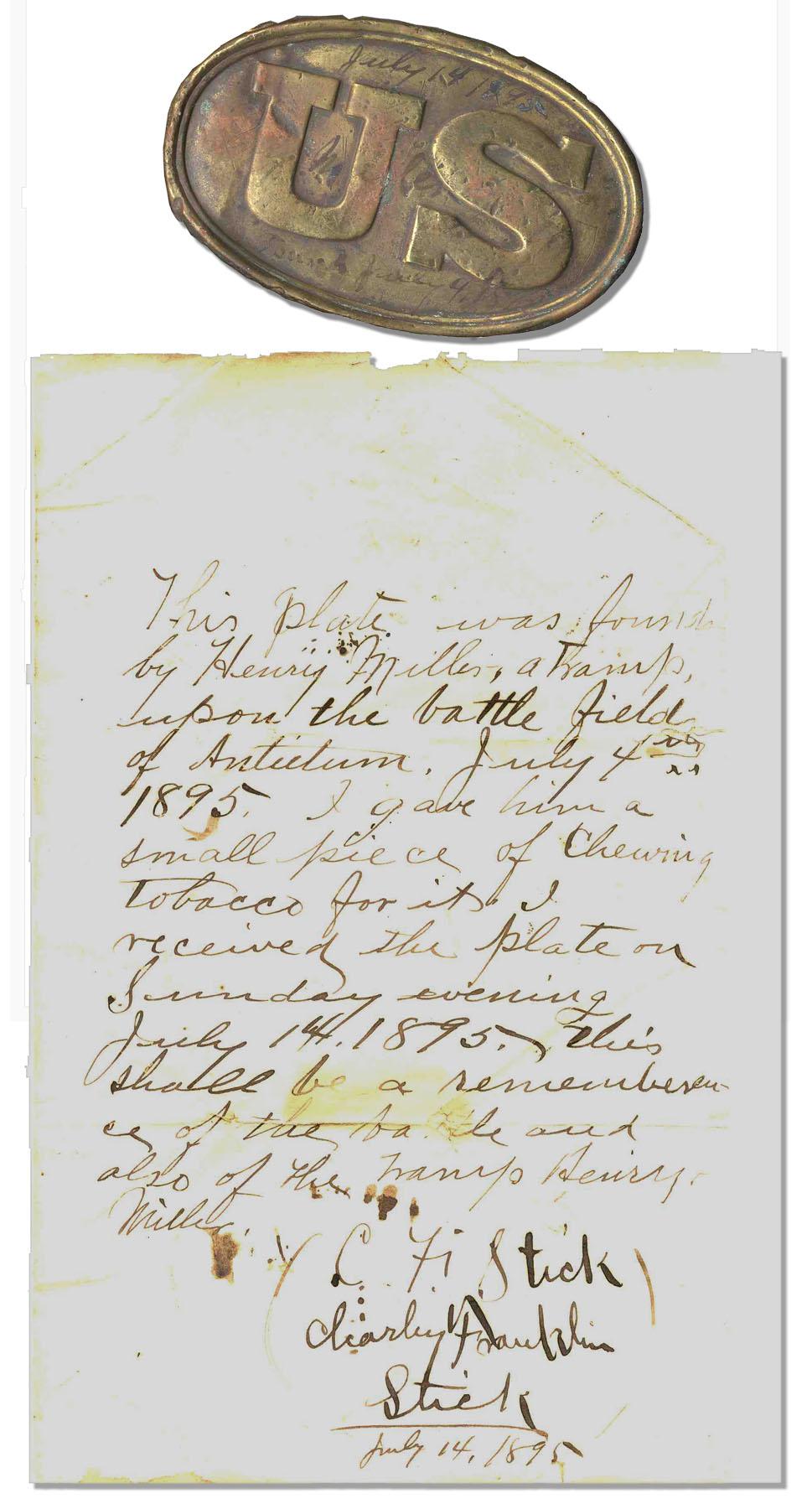 Well-kept Union army cartridge box plate, with the letters ''US'' die-cut on sheet brass face, found on the Antietam battleground in 1895. With autograph letter signed by original owner, Charley Stick, explaining that the plate was purchased from a ''tramp'' by the name of Henry Miller in exchange for a piece of tobacco. Humorous letter reads in full: ''…This plate was found by Henry Miller, a tramp, upon the battle fields of Antietam, July 4th, 1895. I gave him a small piece of chewing tobacco for it. I received the plate on Sunday evening July 14, 1895. This shall be a remembrance of the battle and also of the tramp Henry Miller.'' Signature reads: ''Charley Franklin Stick / July 14, 1895''. With note on verso reading, ''U.S. Plate / Found July 4, 1895''. Letter, measuring 5'' x 8'', has two distinct horizontal folds and several creases, with even toning throughout. Very good condition overall. Plate, measuring 3.5'' x 2'', has sparsely patinated face, numerous dents along edge and an ink inscription, presumably penned by Stick, which reads, ''July 14, 1895 / Miller / Found July 4, 1895''. Very good condition.