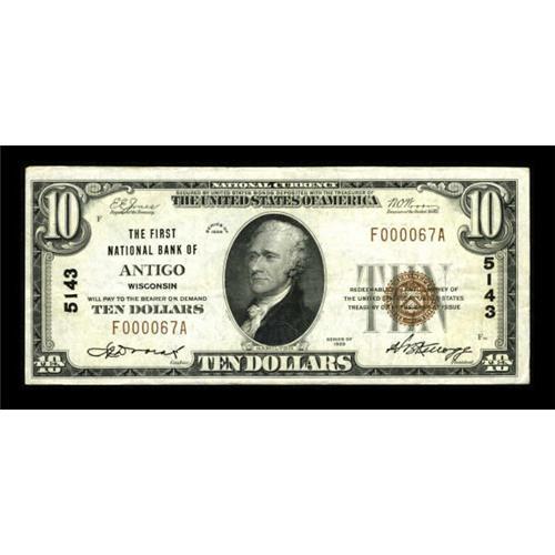 <B>Antigo, WI</B></I> - $10 1929 Ty. 1 <B>The First NB</B></I> Ch. # 5143<BR> A high grade small example from this Langlade County issuer. Bright <B>Extremely Fine.</B></I><BR><BR><b>Shipping:</b> Coins & Currency (<a target="_blank" href="http://www.heritageauctions.com/common/shipping.php">view shipping information</a>)
