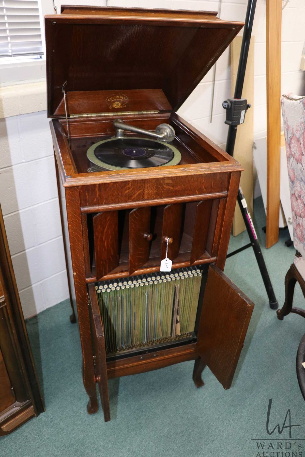 Antique 1/4 cut oak Columbia grafonola with automatic album selector and some accessories. Turn tabl