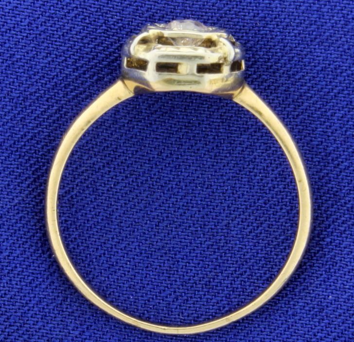 In 14K yellow gold the ring contains a 1/4ct mine cut diamond with H color/I clarity. Size 10 1/2 2.5g