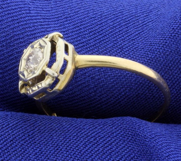 In 14K yellow gold the ring contains a 1/4ct mine cut diamond with H color/I clarity. Size 10 1/2 2.5g
