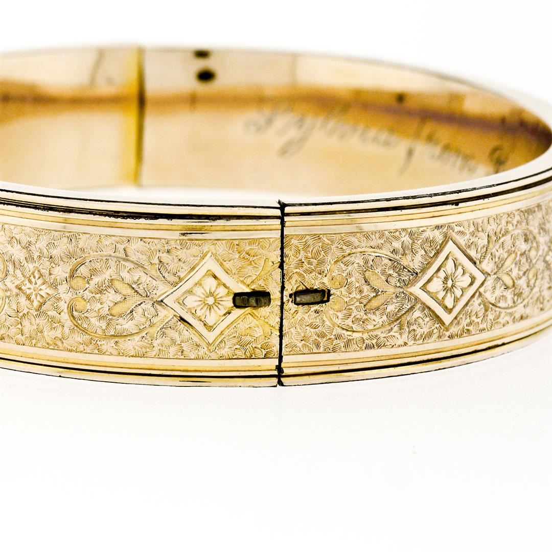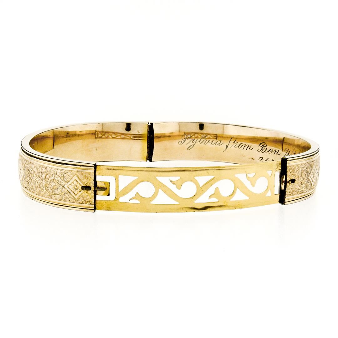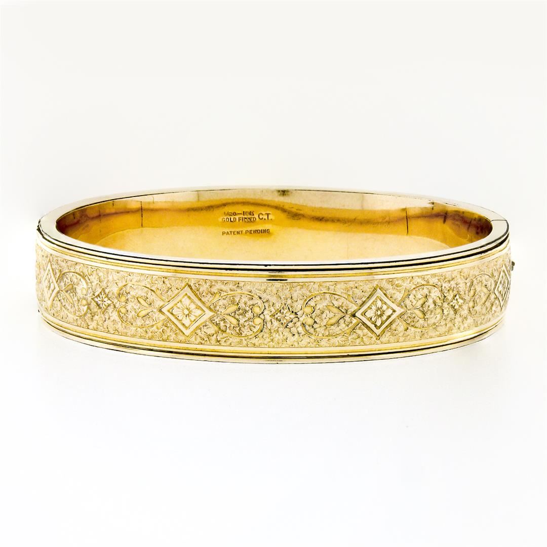 An antique 1937 10k yellow gold filled textured hinge open bangle bracelet. It weighs a total of 18.4 grams, measures 6.50mm wide, and measures 7 inches in length.