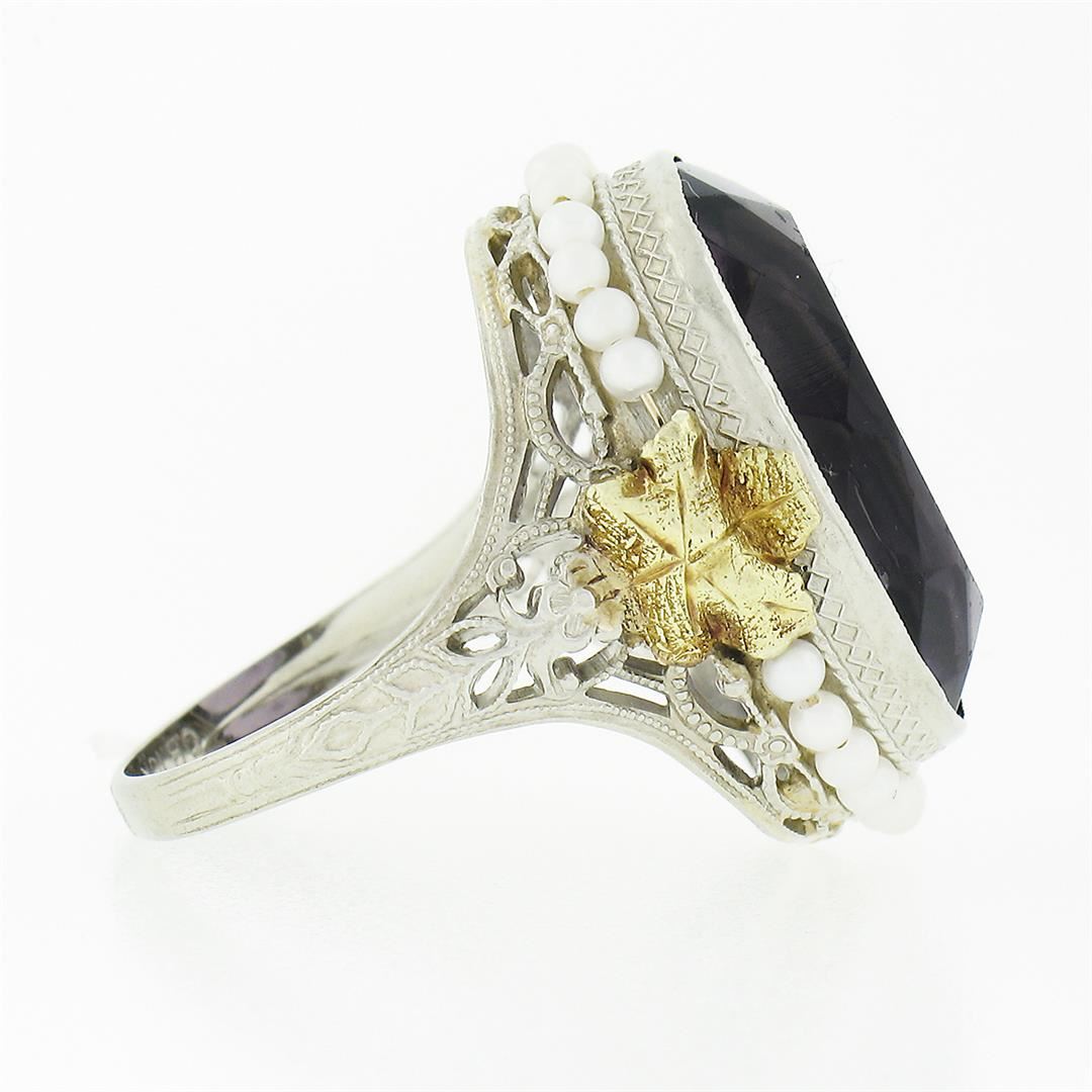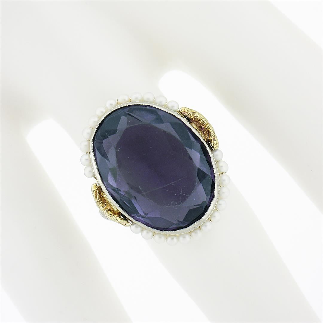An antique solid 10k yellow & white gold filigree ring, with 1 oval brilliant cut purple stone (17.6x13.3mm ), surrounded with 25 round shape cultured seed pearls (1.75mm each). The ring is size 6.0, weighs a total of 5.33 grams, and measures 21.60mm wide