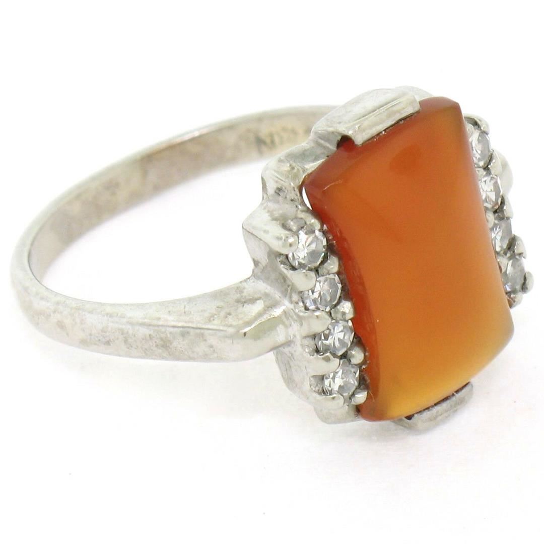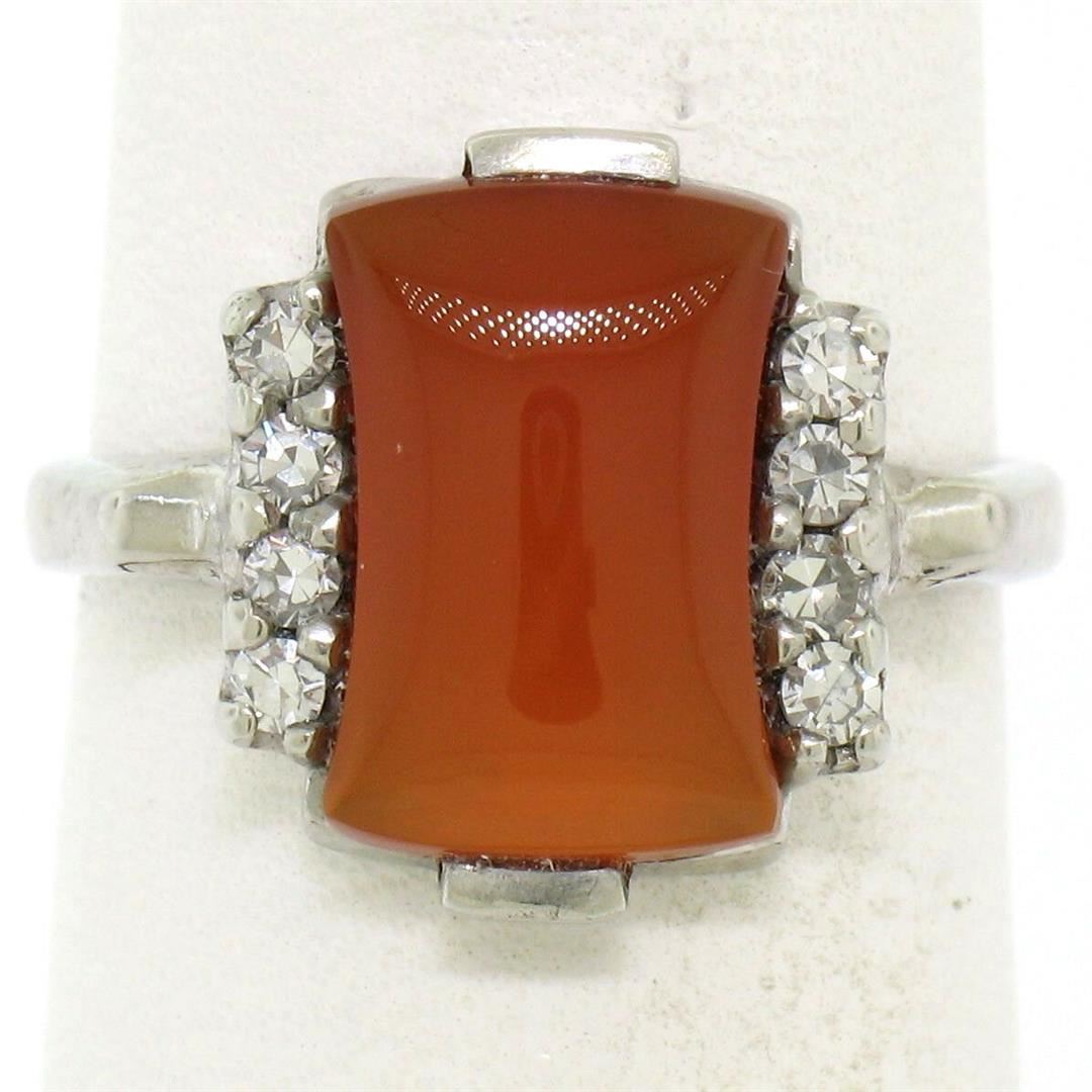 One Antique 10K White Gold Carnelian Solitaire Ring w/ .22ctw Round Diamond Accents. Item Details: Material: 10K Solid White Gold, Weight: 3.14 Grams, Stone(s): (1) Natural Genuine Carnelian - Hourglass Cabochon Cut - Bar Set - Rich Red-Orange Color - 11.60x6.87mm / 1.74ct (approx.), (8) Natural Genuine Diamonds - Round Single Cut - Prong Set - VS1 Clarity - F Color - 0.22ctw (approx.), Total Carat Weight: 1.96 (approx.), Ring Size: 6 , Ring Width: 13.67mm, Ring Height: 4.62mm rise off the finger Signature: MARDEN 10K Condition: Antique ring. Excellent, ready to wear condition!