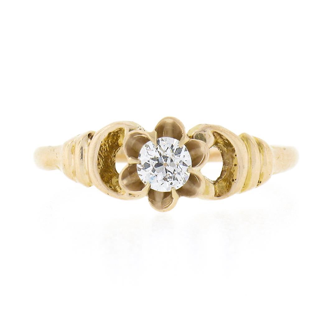 An antique solid 10k yellow gold engagement ring, with 1 old european cut natural diamond (G - VS2 ; 0.25ct). The ring is size 7.5, weighs a total of 1.32 grams, and measures 6.65mm wide.