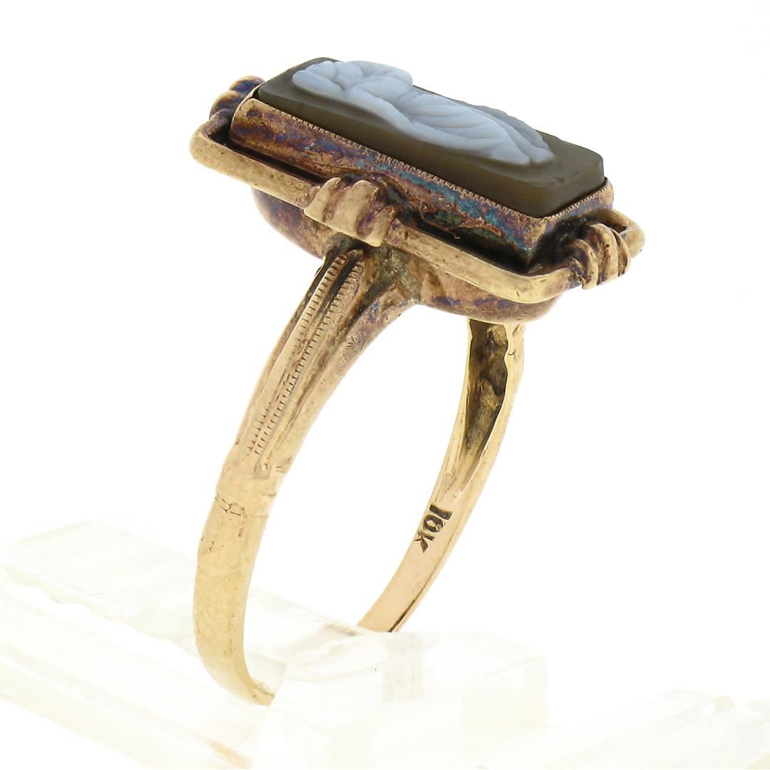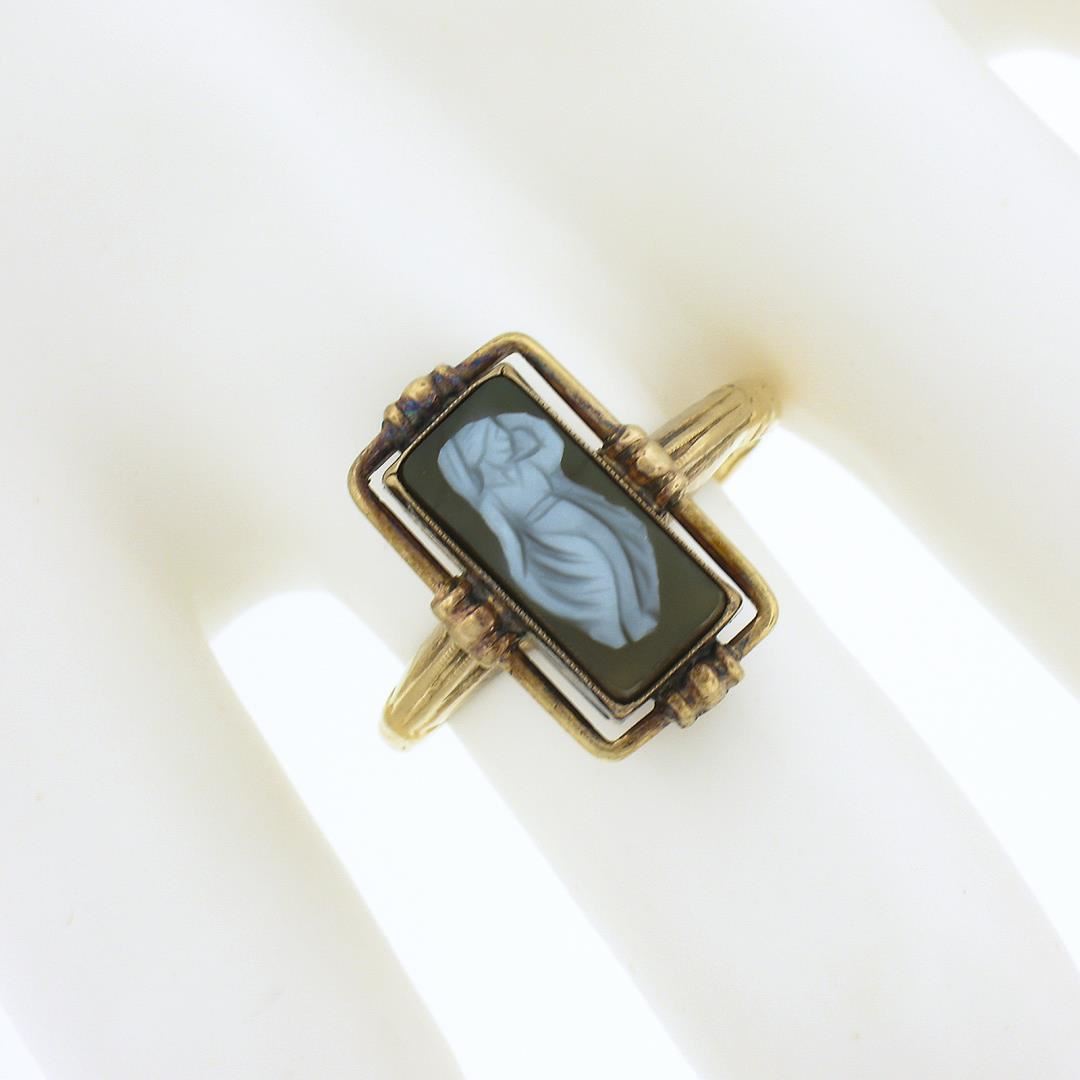 Antique 10k Gold Bezel Rectangular Carved Hard Stone w/ Open Frame Cameo Ring