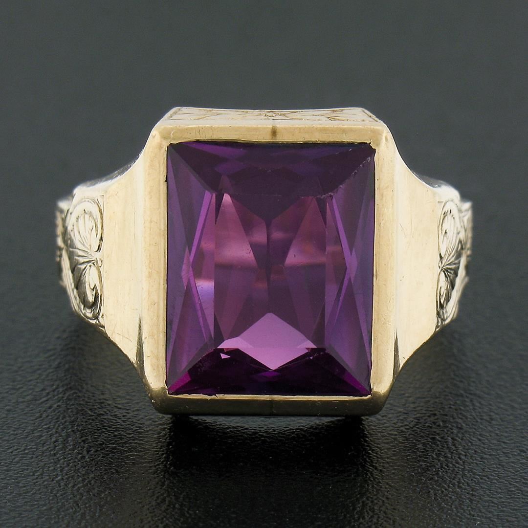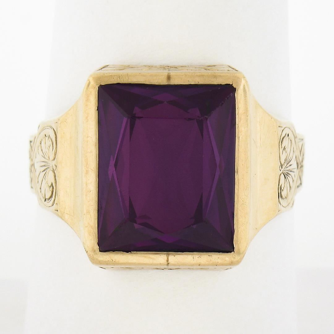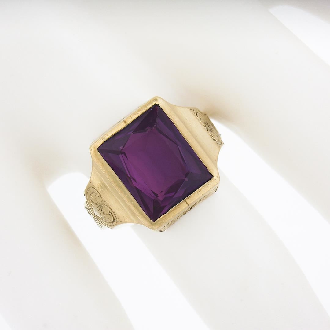 An antique solid 10k yellow gold solitaire ring, with 1 rectangular cut purple stone (11.6x9.4mm). The ring is size 8.5, weighs a total of 5.59 grams, and measures 14.4mm wide.