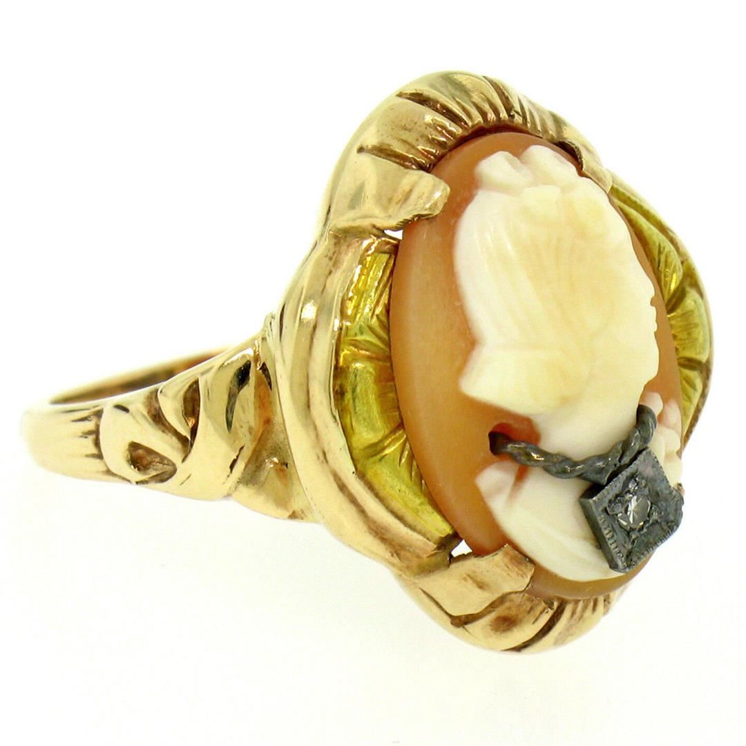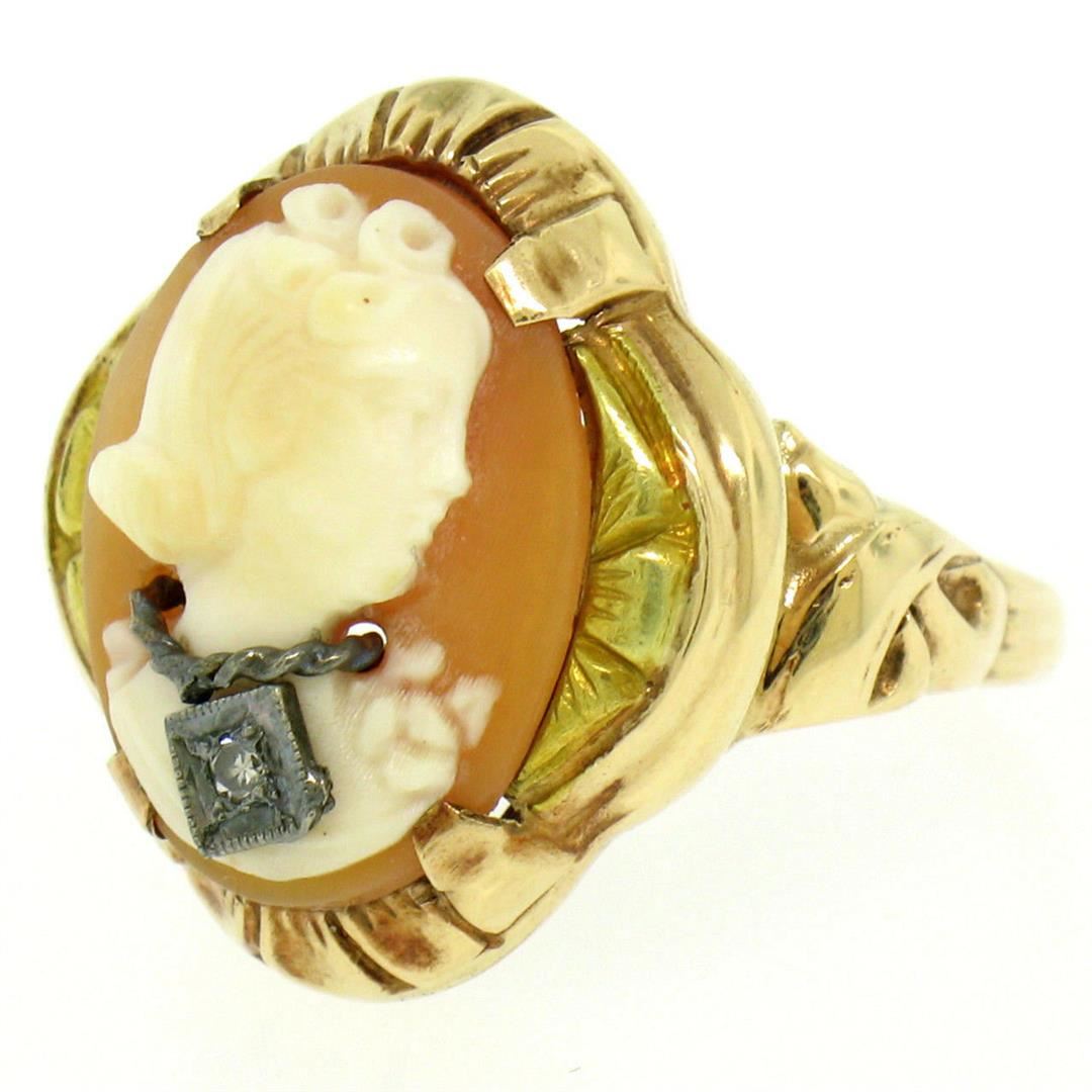 An excellent condition antique 10k rose and green gold ring prong set with an oval carved shell cameo accented with a 0.02ct round single cut diamond. The ring is size 7, weighs a total of 4.7 grams, and measures 20.4mm wide.