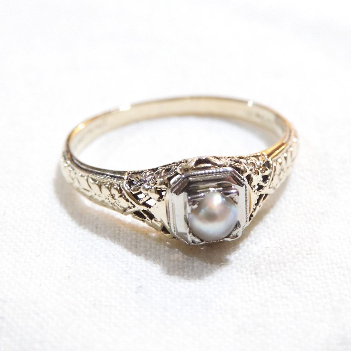 Antique 14K-18K Yellow & White Gold Forget-me-not Band Design with Pearl. Size 6 3/4. Total weight of 1.8 grams.