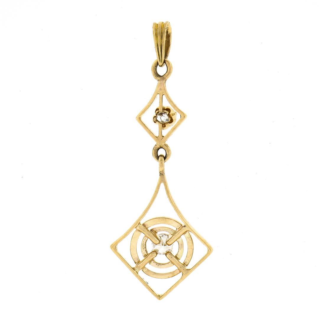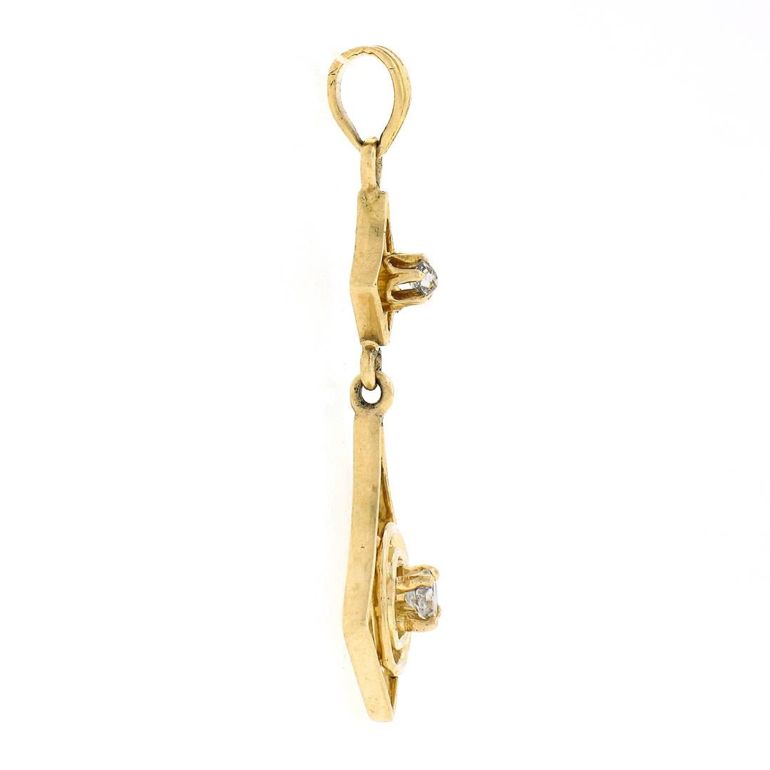 An antique solid 14k yellow gold lavalier pendant, with 2 old mine cut natural diamonds (G/H - VS2 ; 0.12ctw). The pendant weighs a total of 1.25 grams, measures 34.50x12.70mm including the bail, and the inside of the bail measures 4x3mm.
