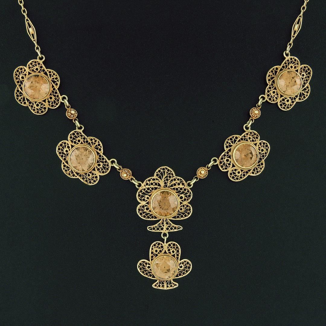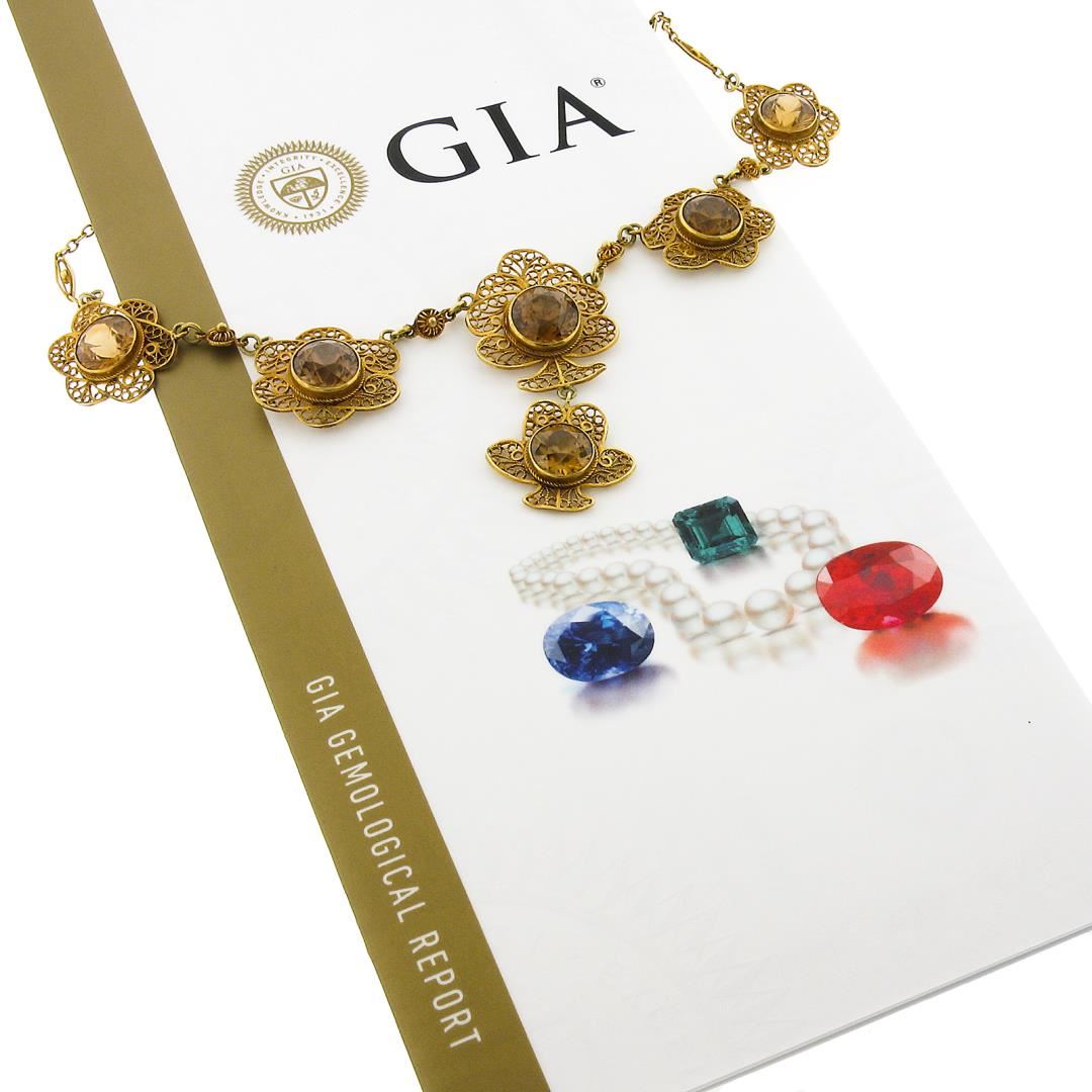 An antique solid 14k yellow gold necklace, with 6 GIA graded round brilliant cut natural zircon (21.40ctw). It weighs a total of 16.74 grams, measures 5.5 inches wide, and measures 17 inches in length. Comes with all original relevant certifications.