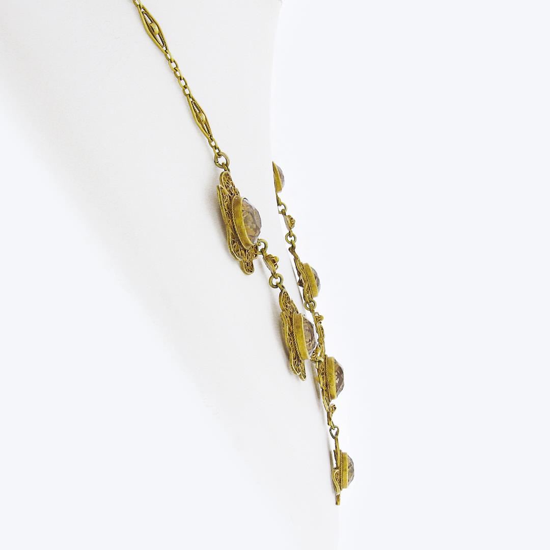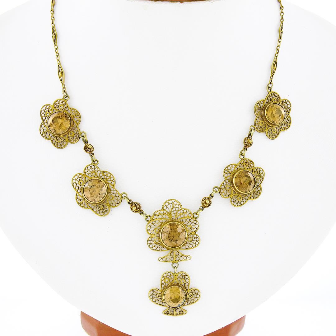 An antique solid 14k yellow gold necklace, with 6 GIA graded round brilliant cut natural zircon (21.40ctw). It weighs a total of 16.74 grams, measures 5.5 inches wide, and measures 17 inches in length. Comes with all original relevant certifications.