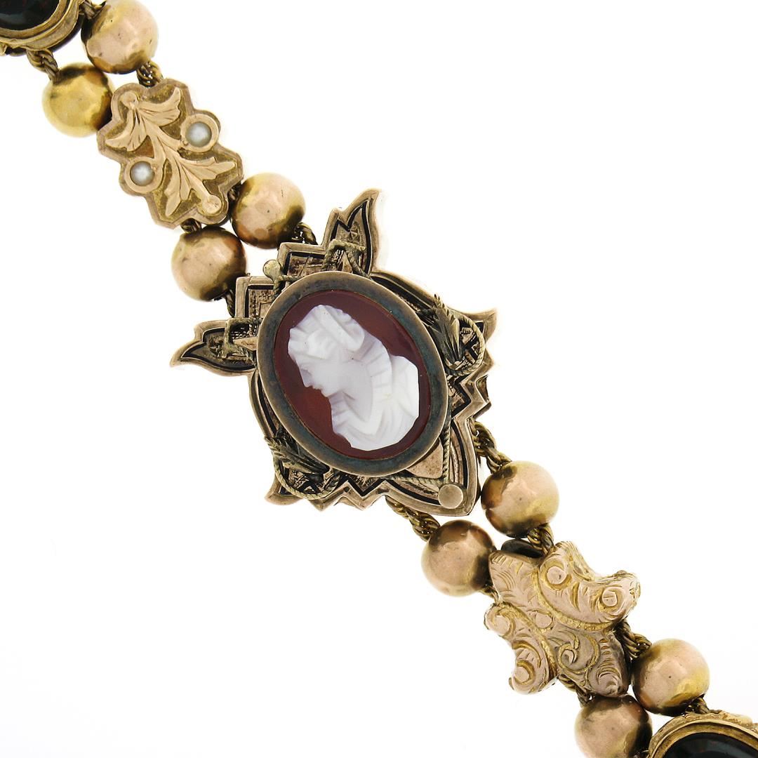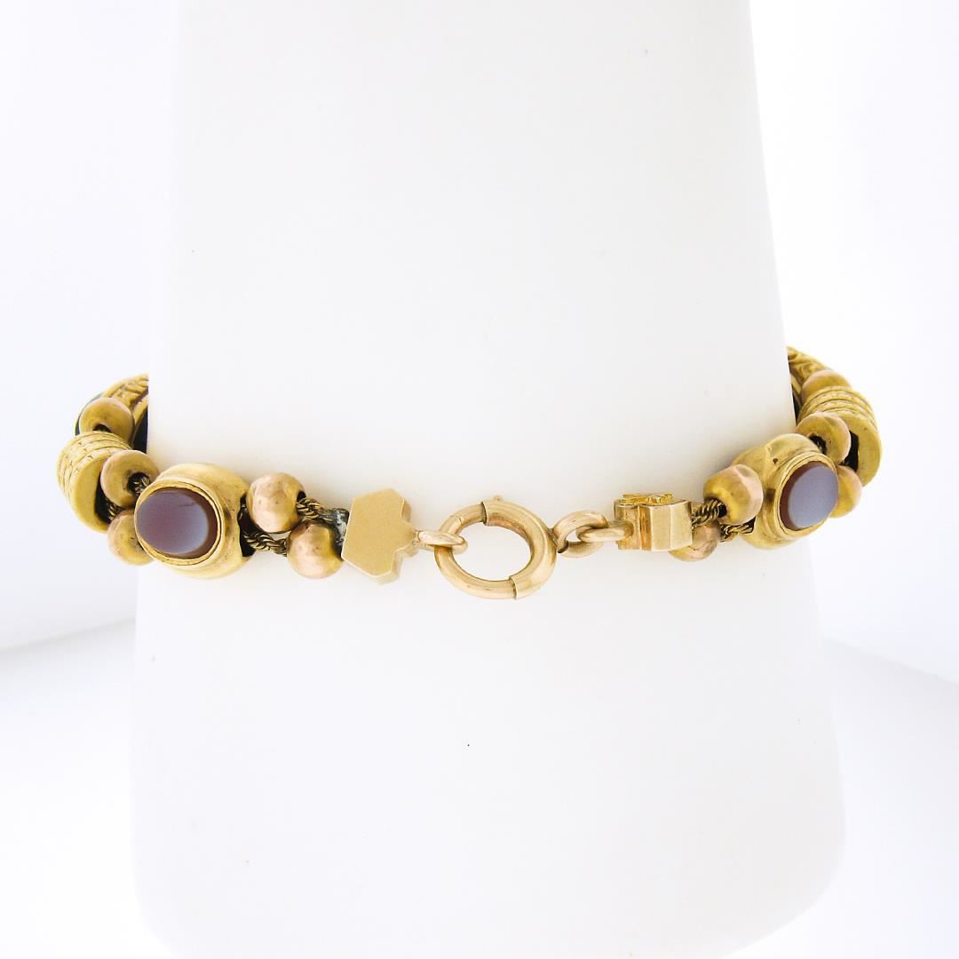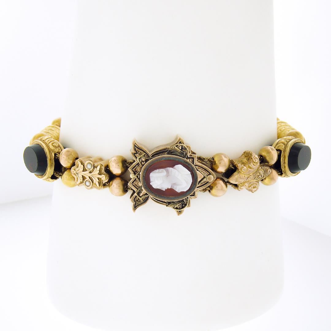 An antique solid 14+k yellow gold charm bracelet, with 1 oval shape cameo natural agate (10.9x8.3mm), and 4 oval cut natural agates (8.6x5.5mm each ), with 4 oval cut natural bloodstones ( 11.6x7.3mm each), and 3 round shape cultured seed pearls (1.2mm each). It weighs a total of 24.25 grams, measures 18.5mm wide, and measures 7 inches in length.