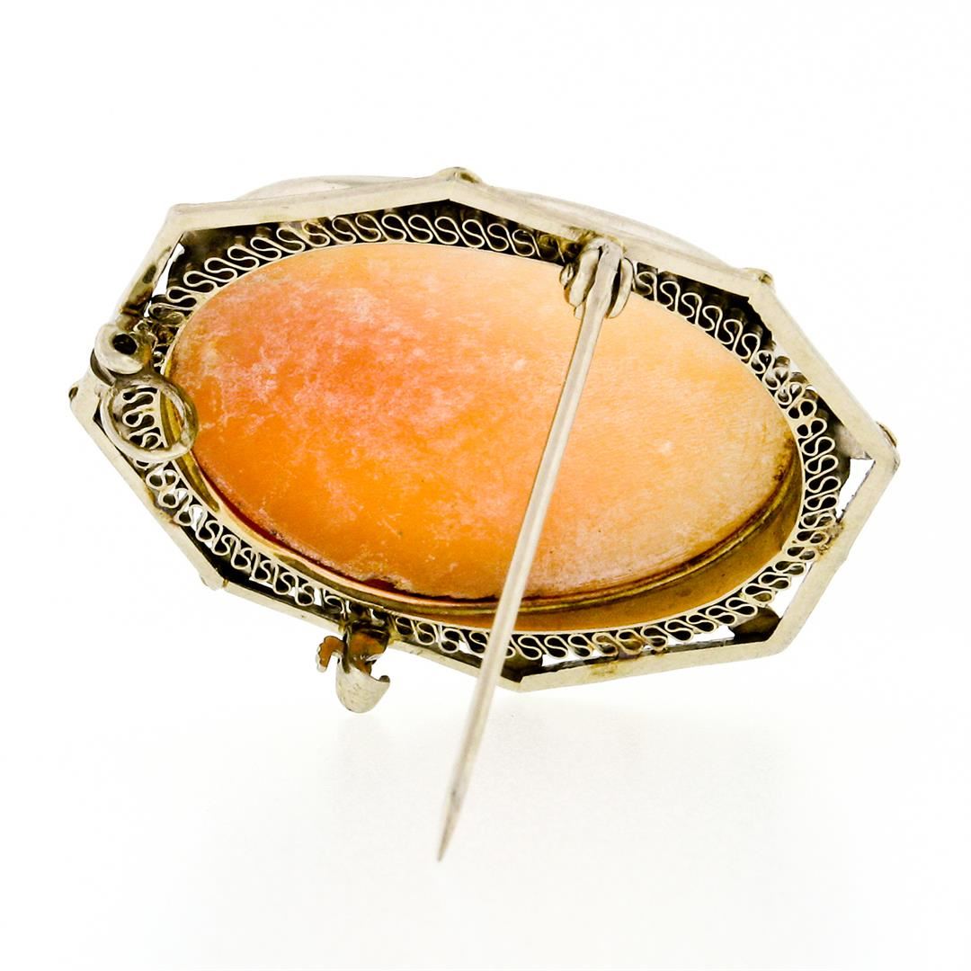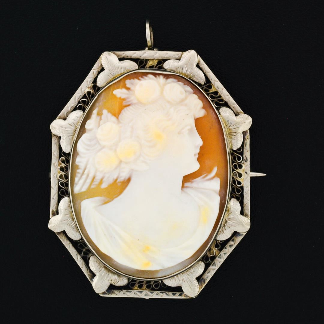 Antique 14K Gold Carved Shell Cameo Hand Etched Floral Filigree Brooch Pendant