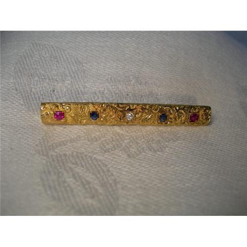 <tr><td>Title:Antique 14K Gold Diamond Ruby Sapphire Brooch</td></tr>