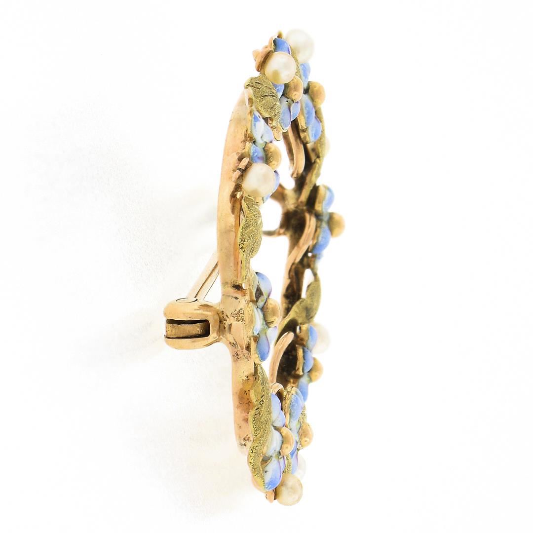 An antique solid 14k yellow gold and enamel wotk floral brooch, with 7 round shape cultured seed pearls (2.3mm each). Measures 29.40x37.10mm and weighs a total of 4.92 grams.