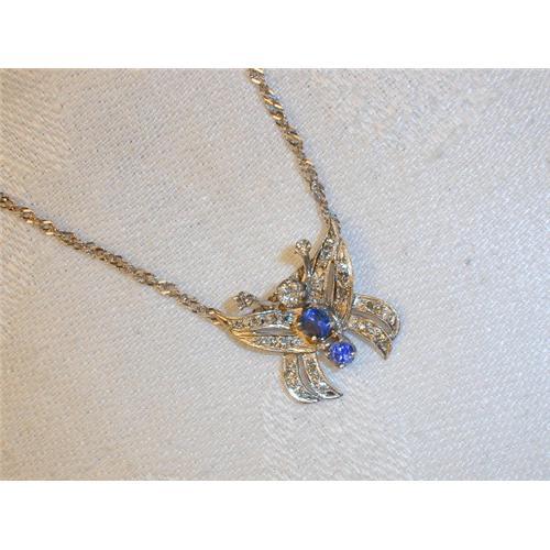 </font></strong>You are looking at an antique 14K white gold butterfly pendant with diamonds and sapphires. There are 18 diamonds measuring about 1mm in diameter, 2 bigger diammonds measuring over 1 mm in diameter and a single one which measures 3 mm in diameter. The total weight of all the diamonds is .30 of a carat. The two genuine sapphires measure from 3 mm to 5 mm in diameter. This piece measures a bit over 7/8 of an inch long by 7/8 of an inch wide. It weighs 4.8 grams. It is in mint condition.</font>