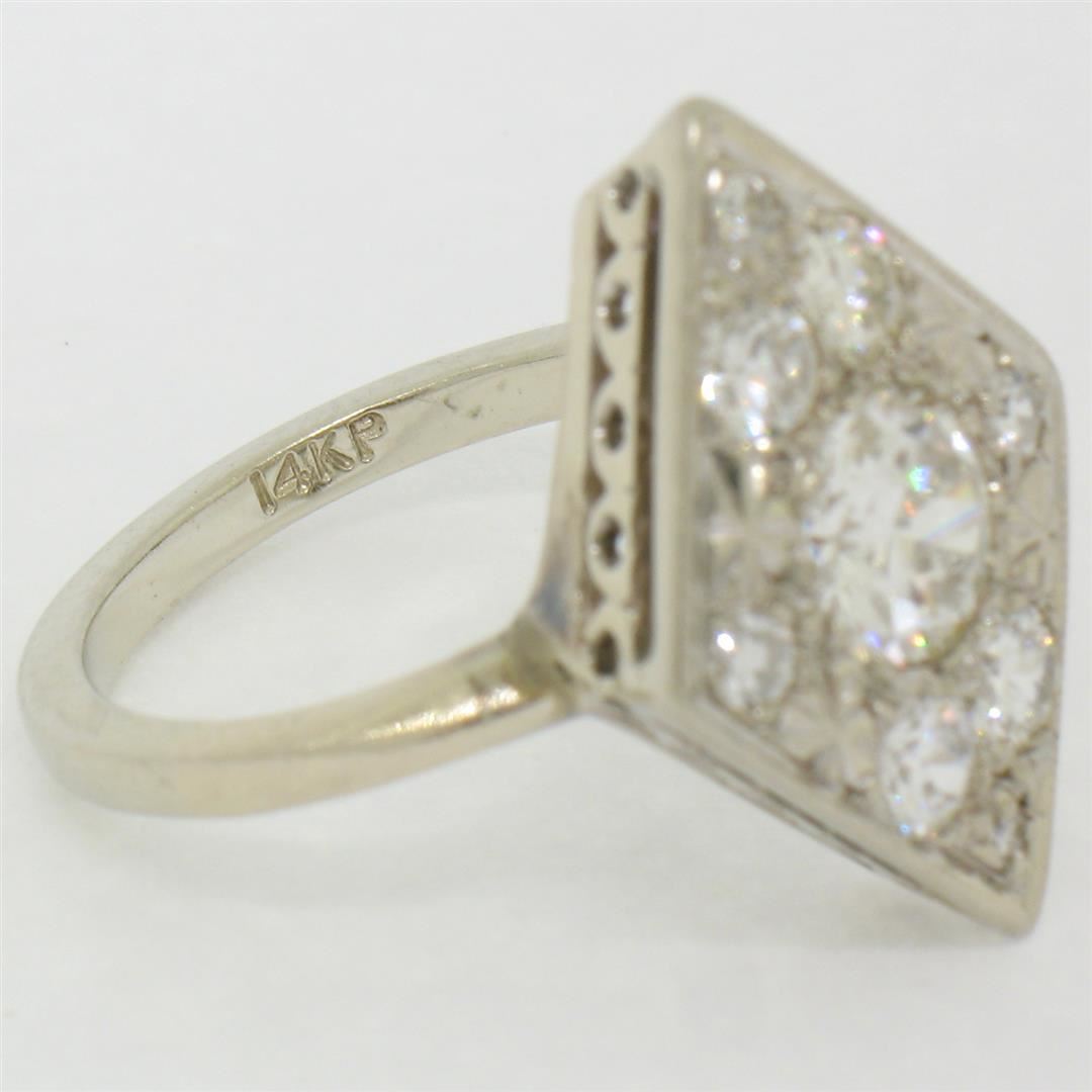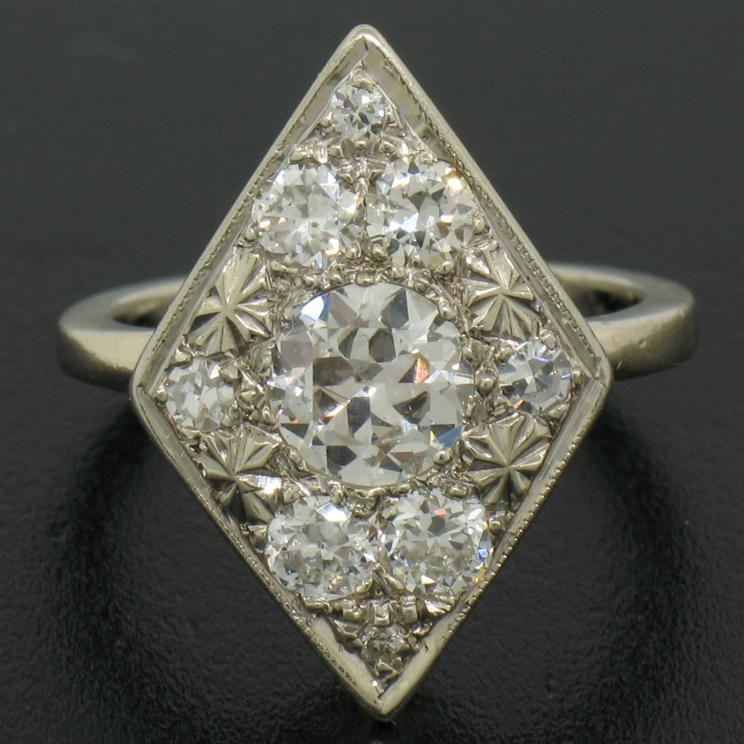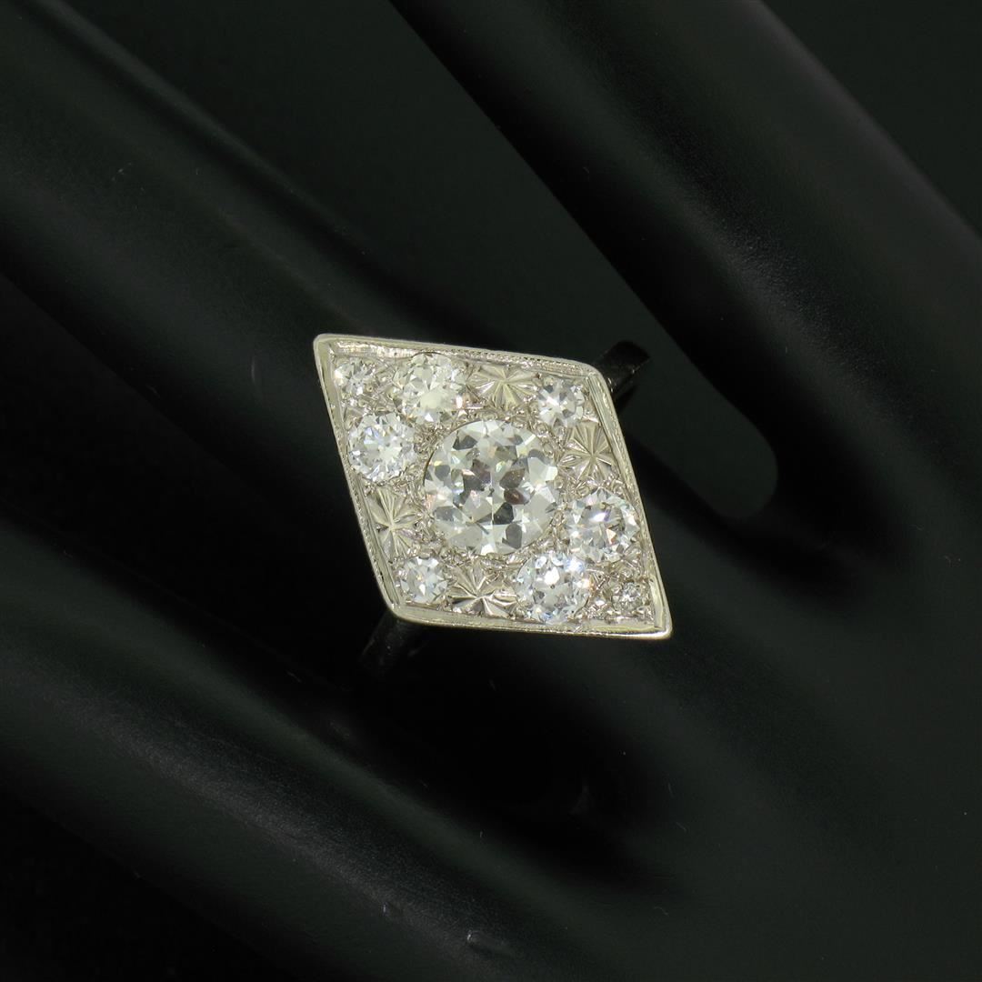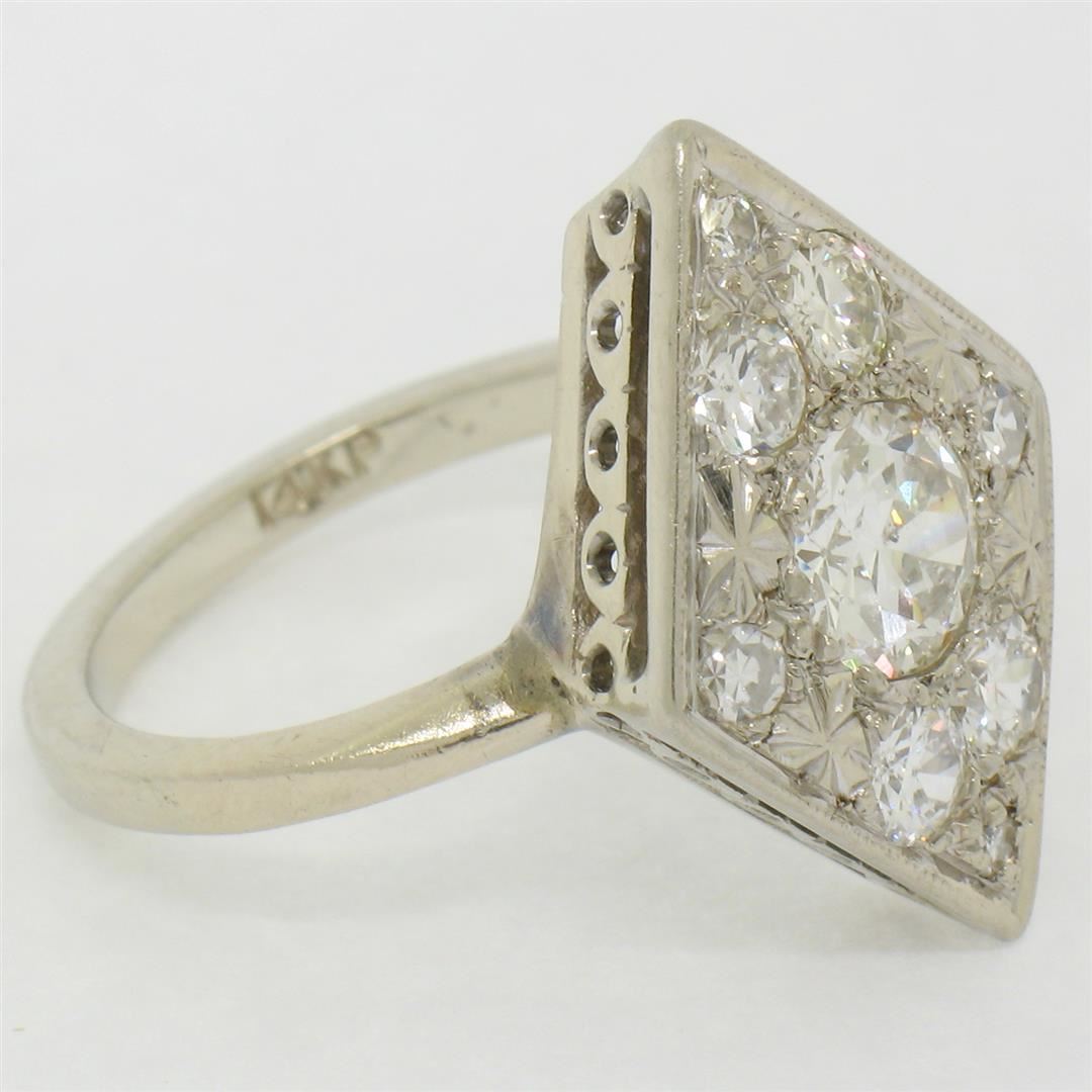 Antique 14K White Gold 1.67ct European & Single Cut Diamond Rhombus Platter Ring. Please see photos and description for all available information. An antique solid 14k white gold platter ring, featuring 1 old european cut natural diamond (G- SI1; 0.92ct), surrounded with 8 old european cut and single cut natural diamonds (G/H- VS2/SI1; 0.75ctw). The ring is size 6.0, weighs a total of 5.07 grams, and measures 14.5mm wide.