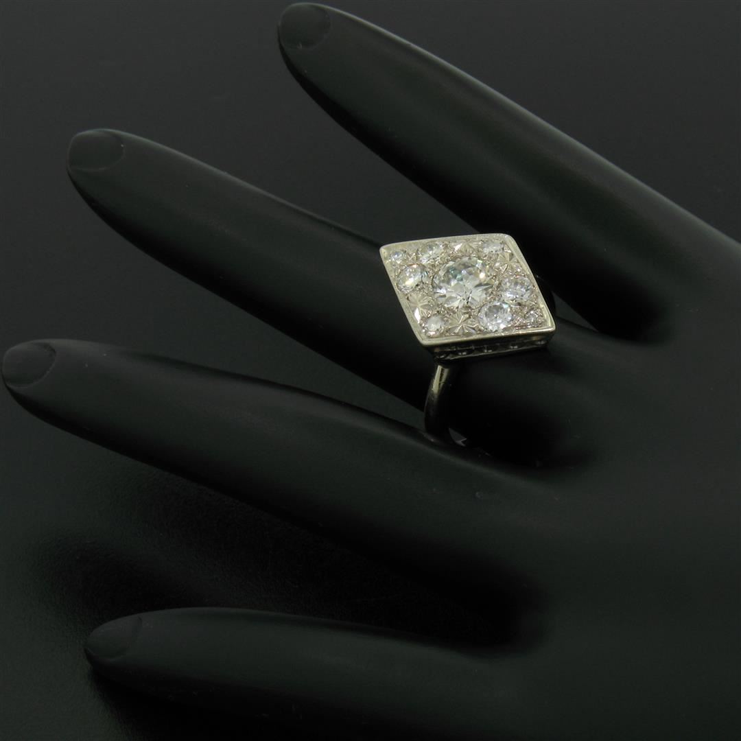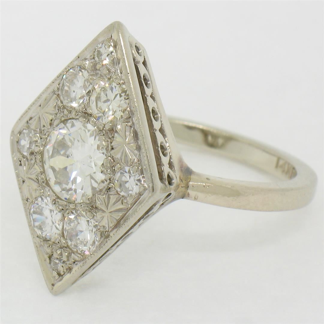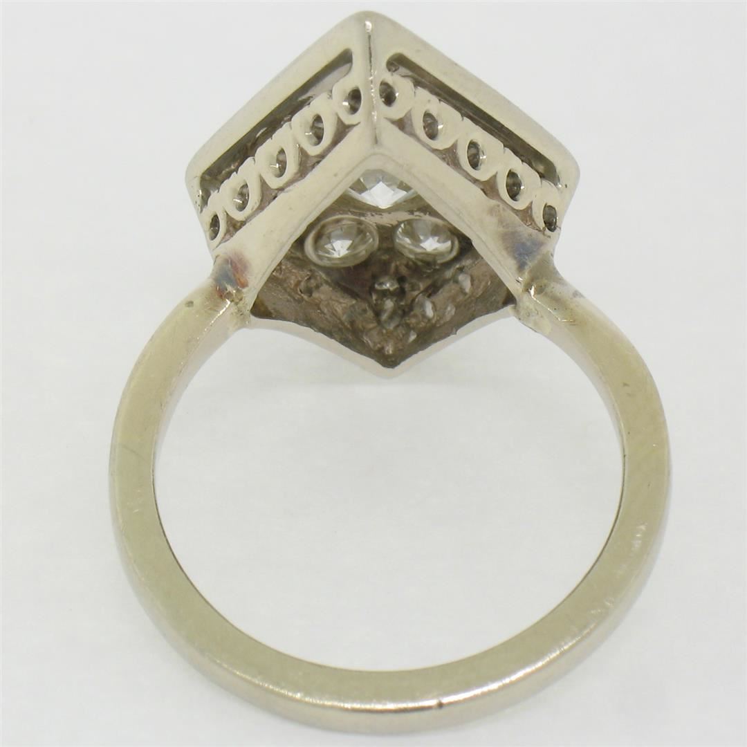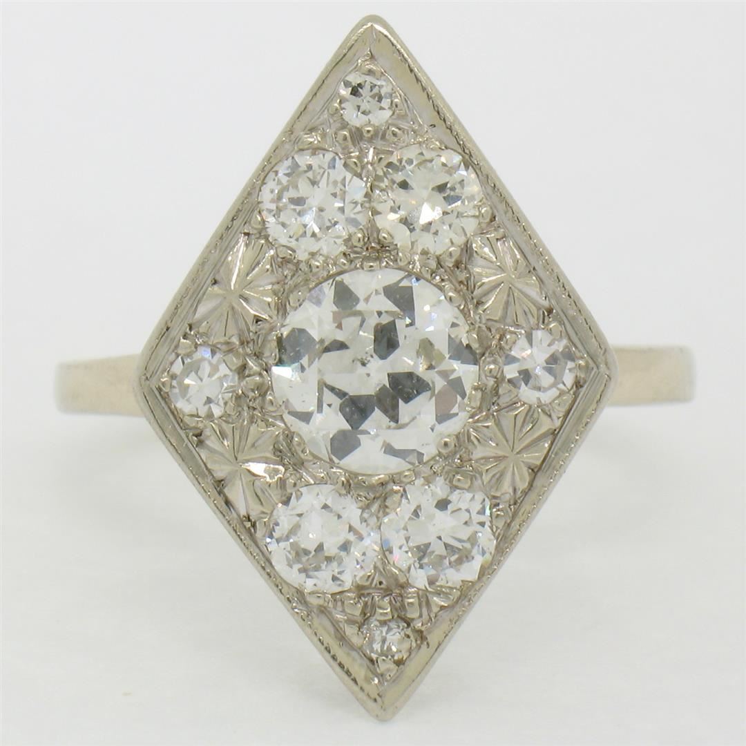 Antique 14K White Gold 1.67ct European & Single Cut Diamond Rhombus Platter Ring. Please see photos and description for all available information. An antique solid 14k white gold platter ring, featuring 1 old european cut natural diamond (G- SI1; 0.92ct), surrounded with 8 old european cut and single cut natural diamonds (G/H- VS2/SI1; 0.75ctw). The ring is size 6.0, weighs a total of 5.07 grams, and measures 14.5mm wide.