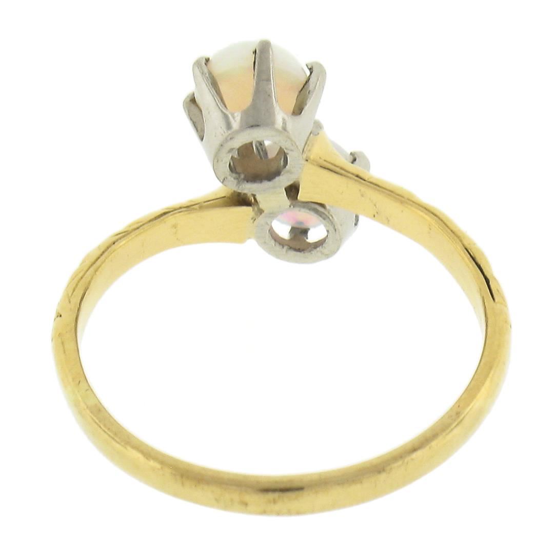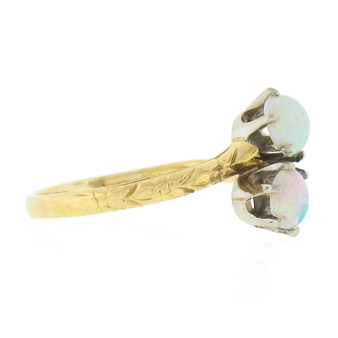 An antique solid 14k yellow gold bypass ring, with 2 round cabochon cut natural opals (4.3mm each). The ring is size 4.5, weighs a total of 1.65 grams, and measures 10.45mm wide.