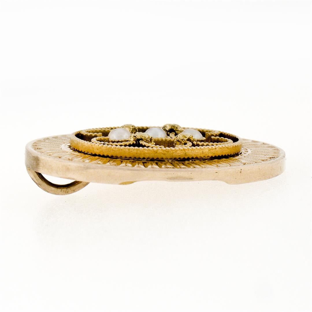 An antique solid 14k yellow gold pendant. with 3 round shape natural seed pearls (2.70mm). The pendant weighs a total of 4.65 grams, measures 27.60x21.30mm including the bail.