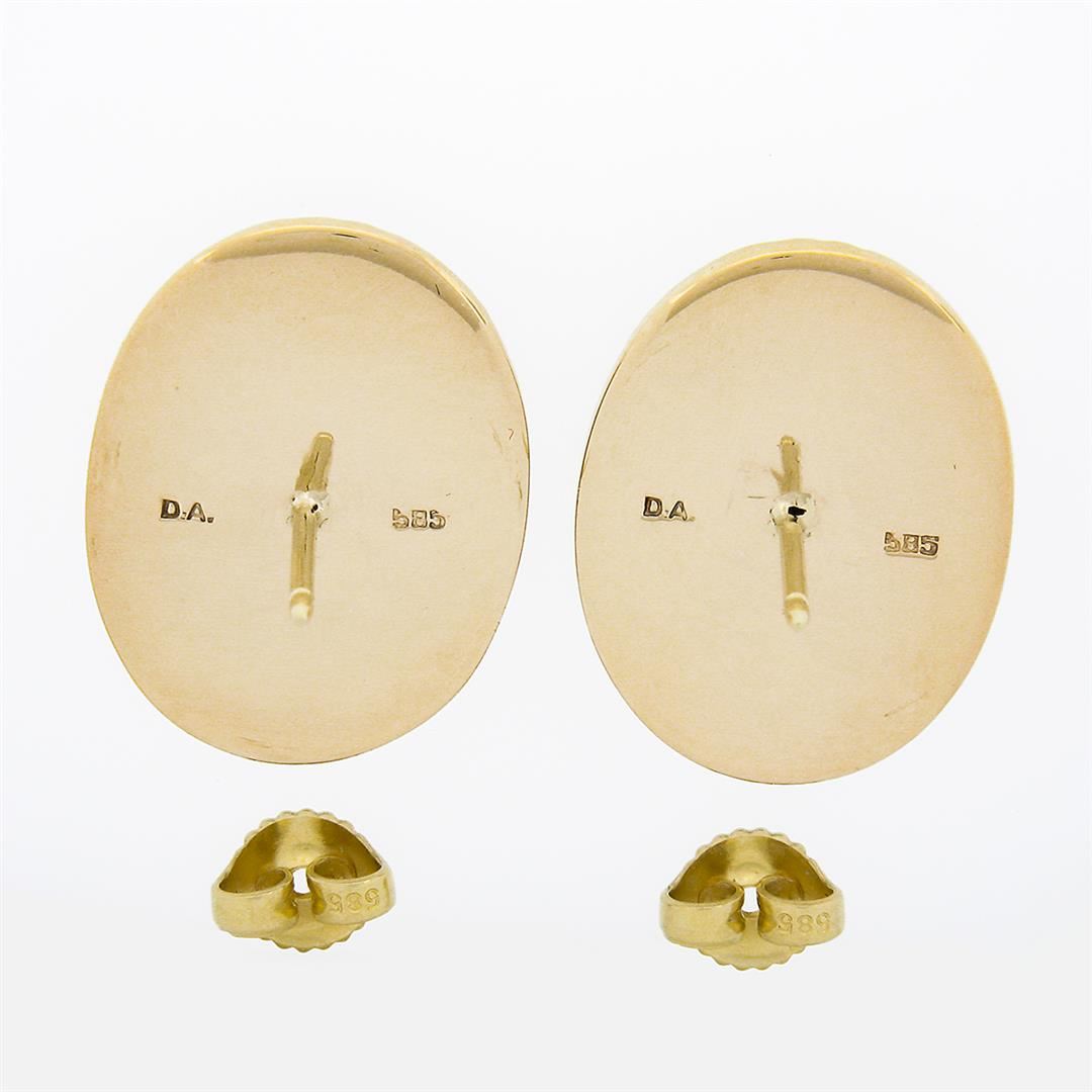 An antique solid 14k yellow gold pair of button earrings, featuring 2 oval cut natural carnelians (10.80x15.50mm each). The earrings measure approximately 21.20x16.30mm and weigh a total of 7.68 grams.